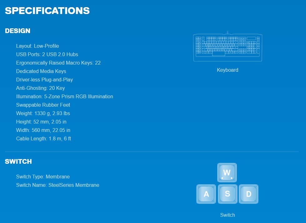 Il modello Apex 350 come anche il modello Apex 300 sono tastiere a membrana quindi ‘’classiche’’ per coloro che ancora non riescono, stranamente a mio avviso, ad abituarsi ad una tastiera con switch meccanici. Come velocemente anticipato la Apex 350 è dotata di numerosi tasti extra (Macro, Multimediali) che la rendono ideale per giochi MMO, MOBA o altri dove spesso la presenza di tasti dedicati può aiutare e non poco. Completano le caratteristiche di maggior spicco una retroilluminazione a 5 zone RGB ed una matrice migliorata che garantirà a dispetto di altre tastiere a membrana la pressione di fino 20 tasti contemporaneamente (analizzeremo e spiegheremo meglio tale e reale capacità di anti-ghosting).