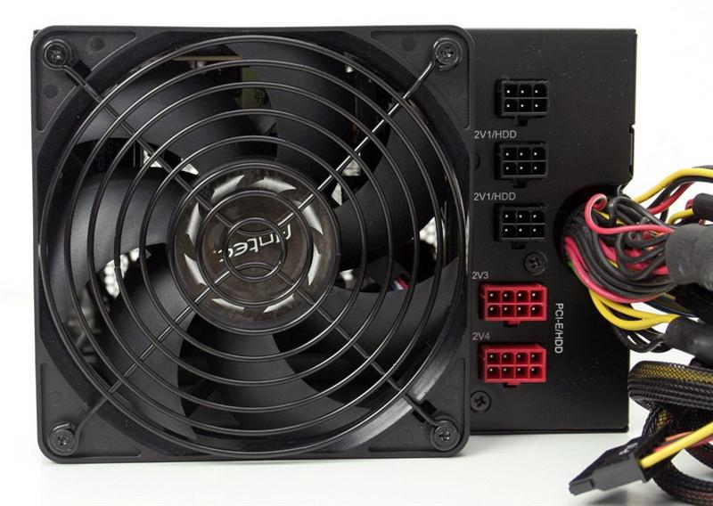Sul retro del PSU accanto alla ventola da 120mm che serve per il raffreddamento interno ed al contempo stesso allo smaltimento del calore all'interno del cabinet, senza disturbare i flussi interni d'aria generati dalle altre ventole, notiamo i connettori per i cavi modulari, in particolare ci sono 3 connettori identificati con +12v1/HDD a cui vanno collegati i cavi modulari molex e/o  Sata e due connettori identificati +12v3 e +12v4 a cui vanno connessi i cavi per alimentare le schede grafiche, oltre agli altri presenti sul corpo PSU.