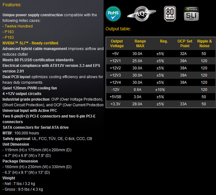 Alimentatore Antec CP-1000 Designed for Antec - Specifiche Tecniche