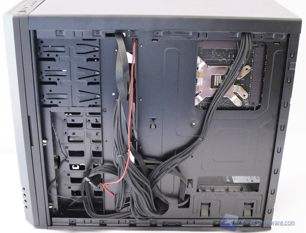 In questo paragrafo analizzeremo velocemente il montaggio di un sistema Intel ed il conseguente cablaggio posteriore ed anteriore. Anche per gli utenti poco esperti la procedura è molto facile: per prima cosa dovrete montare l’alimentatore alla base del cabinet, facendo attenzione a passare il connettore di alimentazione della scheda madre attraverso il retro del case insieme anche a quello ausiliario EPS ad 8pin. Nel caso il nostro alimentatore non abbia cavi abbastanza lunghi possiamo optare sempre per delle prolunghe. Fatto questo, consigliamo l’installazione della scheda madre con relativo dissipatore montato e successivamente della scheda video. Successivamente inseriamo i cestelli con gli SSD/Hard Disk precedentemente montati e colleghiamo il tutto.