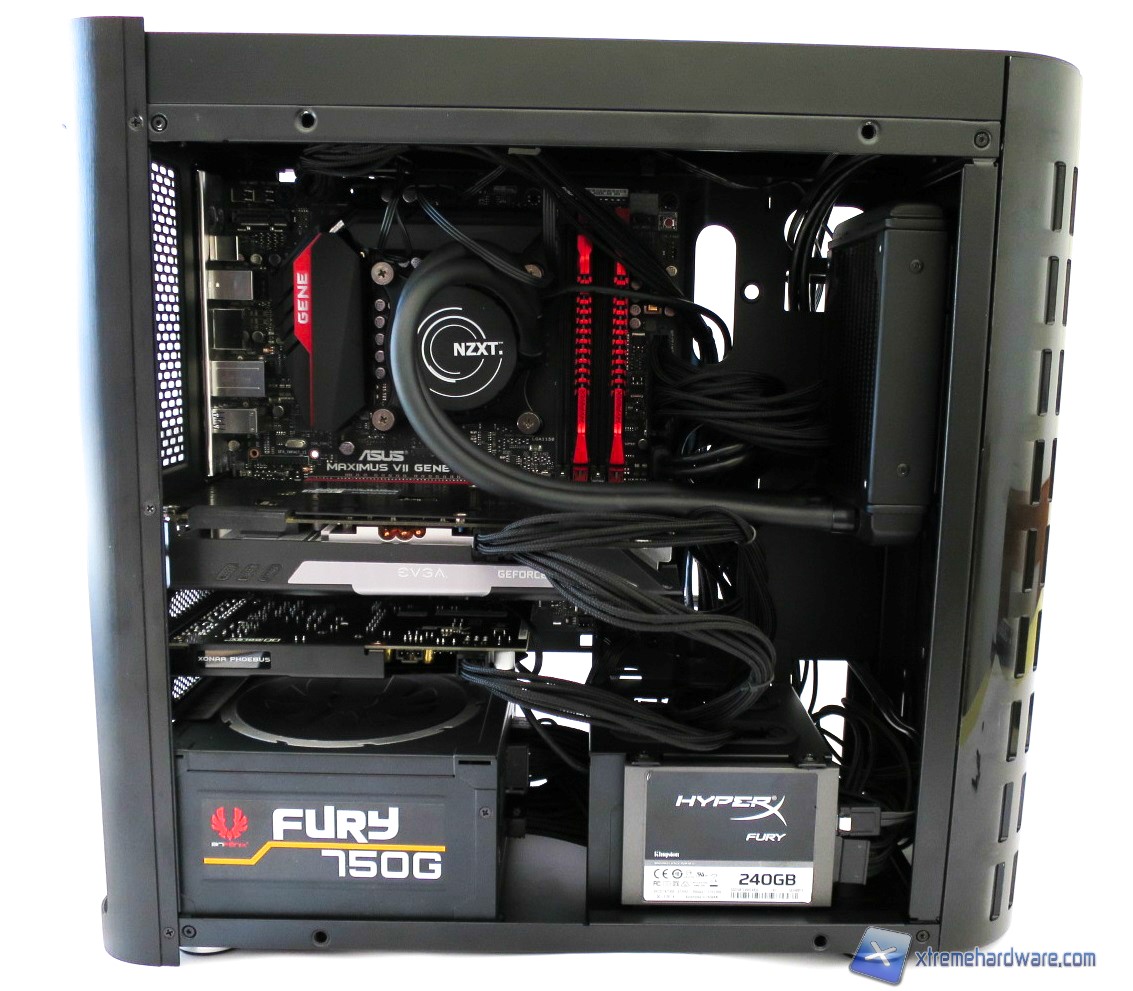 In questo paragrafo analizzeremo velocemente il montaggio di un sistema Intel ed il conseguente cablaggio posteriore ed anteriore. La procedura è facile ma richiede un minimo di pazienza viste le dimensioni ed il layout del case: per prima cosa dovrete montare l’alimentatore alla base del cabinet, purtroppo come detto il connettore ausiliario EPS ad 8pin non potrà essere fatto passare nell’unico foro presente nel tray della scheda madre (come vedremo nelle immagini). Nel caso il nostro alimentatore non abbia cavi abbastanza lunghi possiamo optare sempre per delle prolunghe. Fatto questo, consigliamo l’installazione della scheda madre con relativo dissipatore montato e successivamente della scheda video. Successivamente inseriamo il supporto/cage con gli SSD/Hard Disk precedentemente montati.