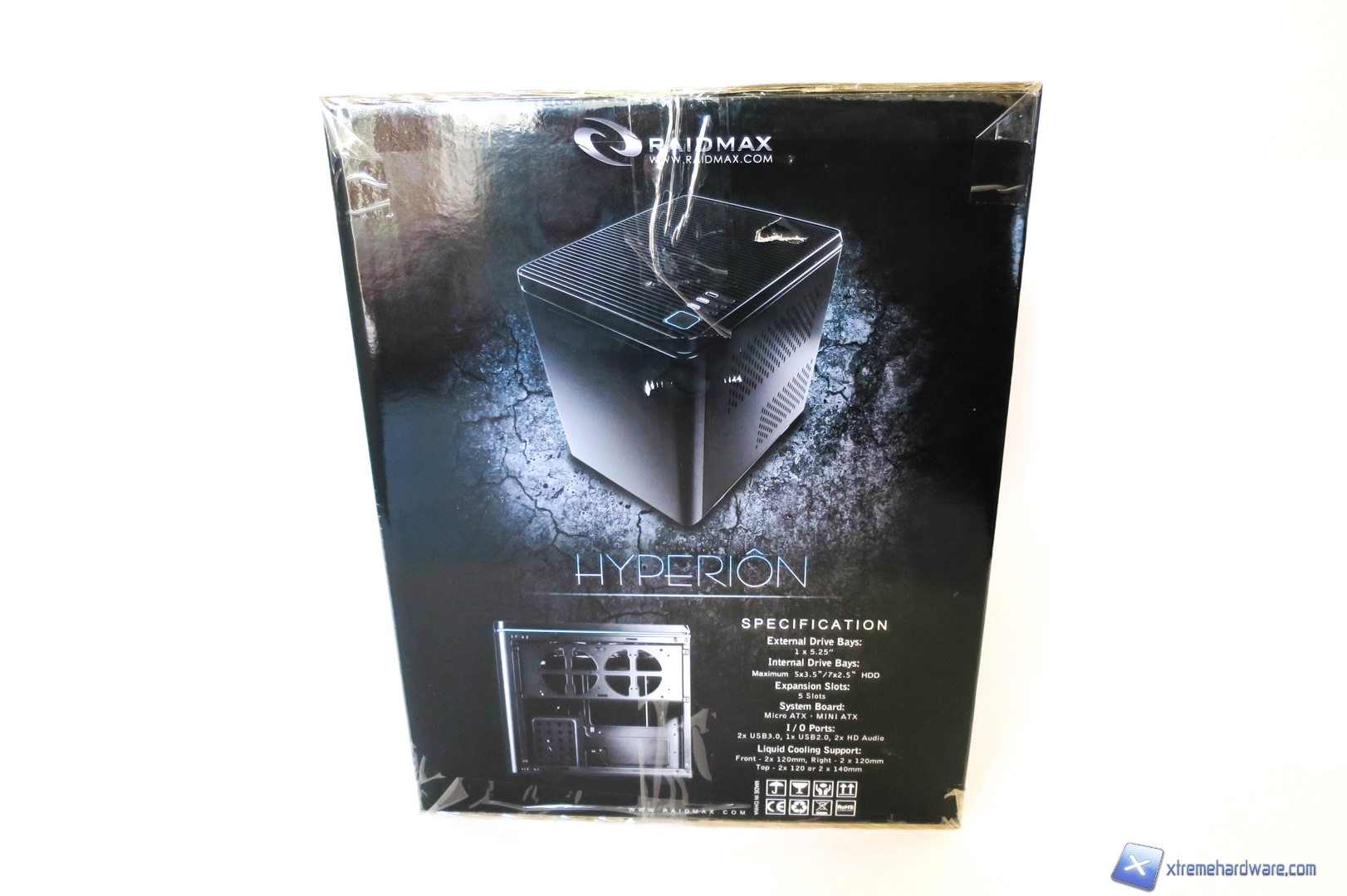 Il Raidmax Hyperion è ospitato in una classica confezione di cartone rigido con una superfice lucida che risalta le immagini e le informazioni su di essa presenti. Nella parte frontale troviamo in bella vista un’immagine illustrativa del case con un disegno “meccanico” che la contorna. Poco più sotto il nome del prodotto.