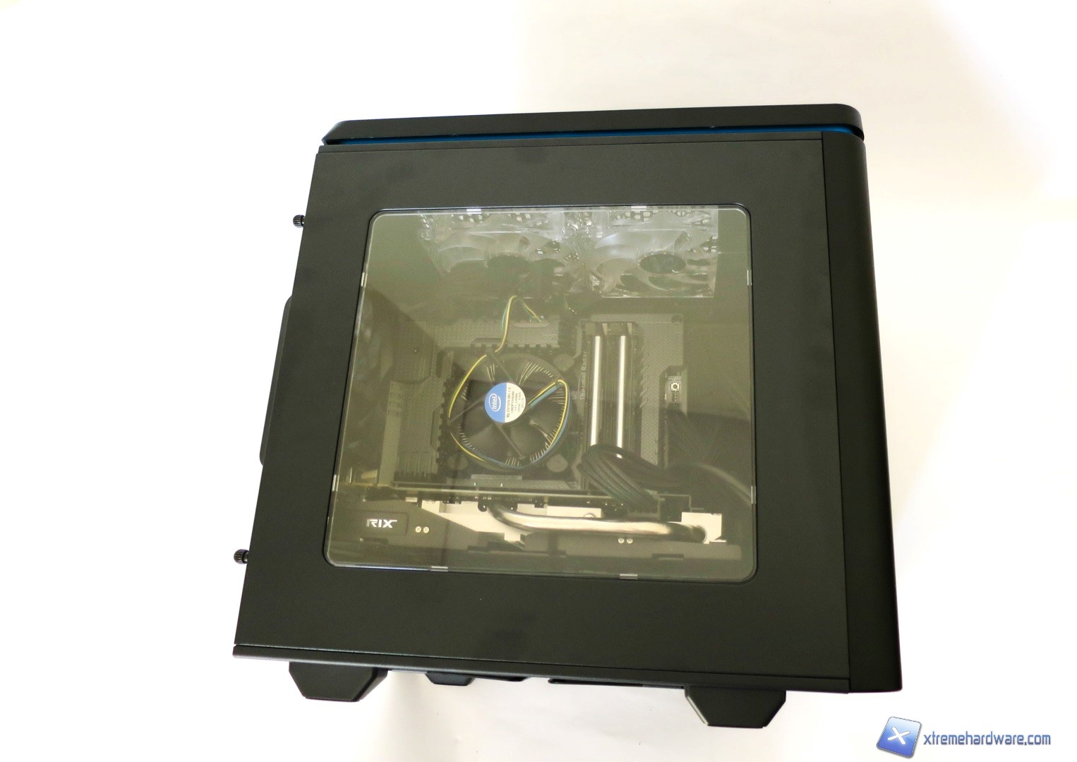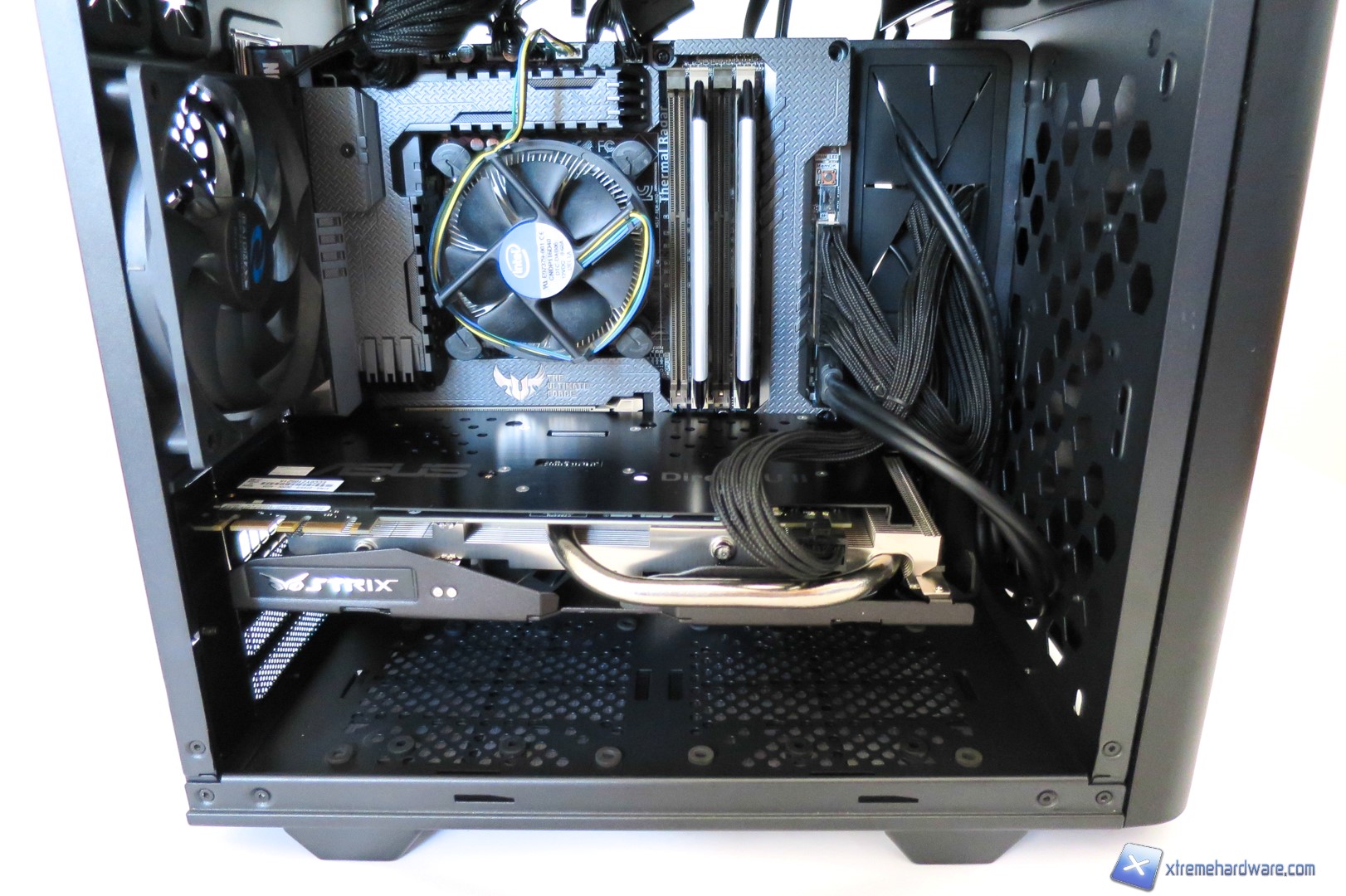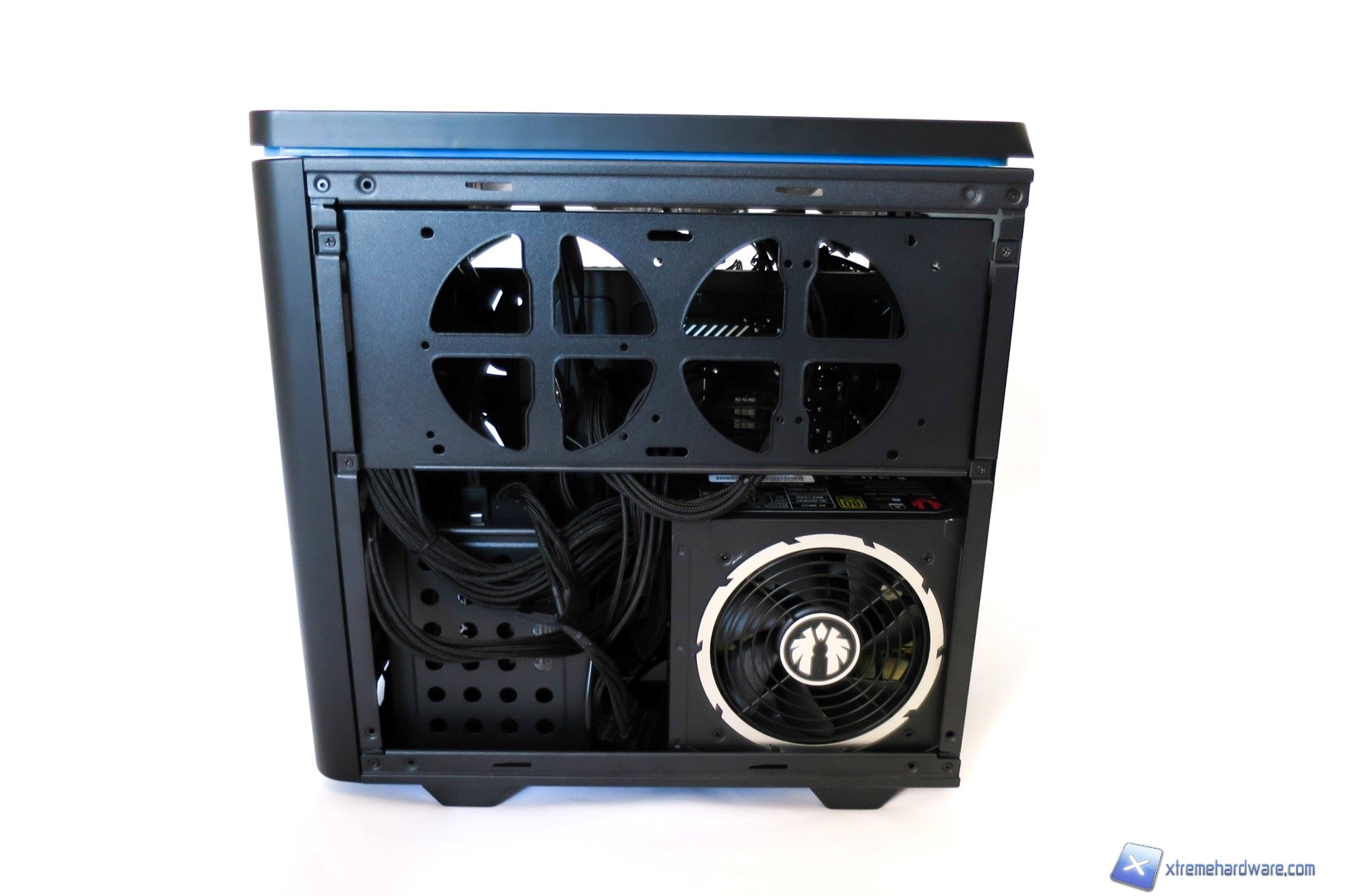 Se si possiede un dissipatore Intel, tramite il solito sistema Push-Pin, sarà possibile installarlo successivamente, così come un dissipatore grazie al generoso foro nel tray della scheda madre. Il foro infatti è molto ampio e permette ogni manutenzione successiva. Dopo aver montato il dissipatore sulla scheda madre, sarà necessario montare la scheda video, le RAM ed infine procedere all’assemblaggio dei cavi di connessione del cabinet alla scheda madre. Essendo un case bicamera potremo, dopo aver installato l’alimentatore, organizzare al meglio tutti i cavi e poi passarli tramite i fori lato tray e connettore tutte le periferiche. Lo spazio è adeguato ed anche il montaggio è veloce.
