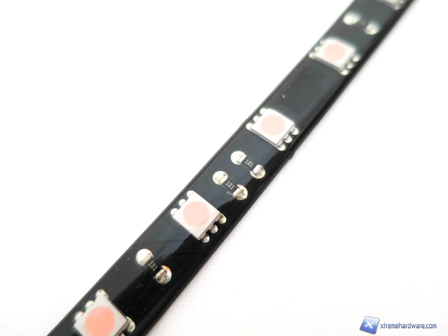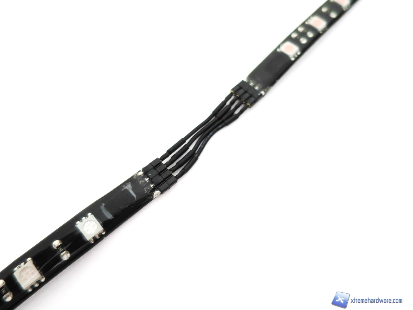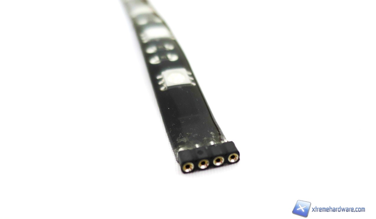 Agli estremi di ogni strip troviamo infine due connettori dotati di quattro fori che permetteranno non solo di collegare la singola striscia al connettore Molex con il relativo header ma anche di collegare tra loro più strip per creare diversi effetti di luce o semplicemente per coprire superfici che superano i 60cm, ad esempio contornare una paratia finestrata di un case.