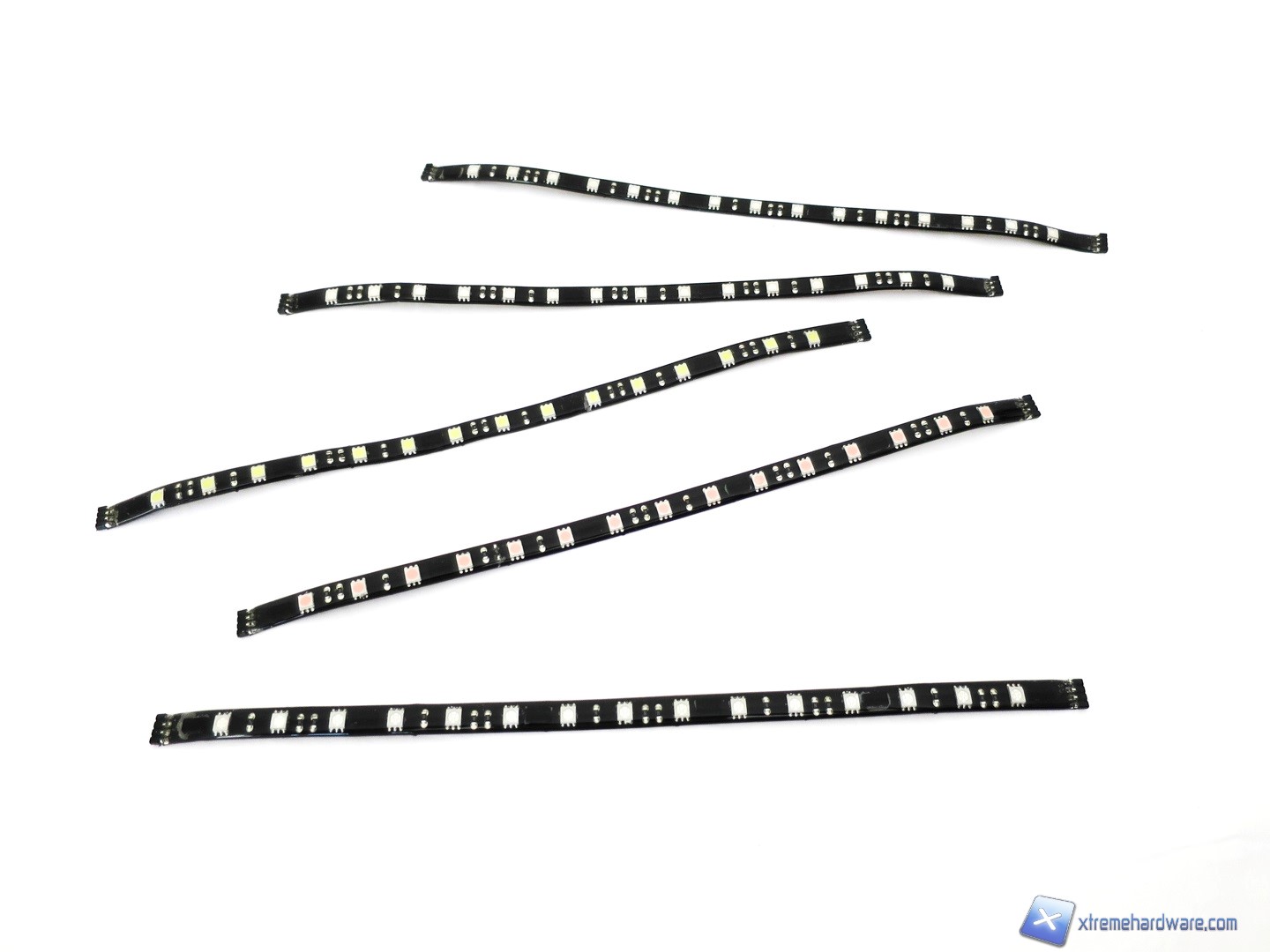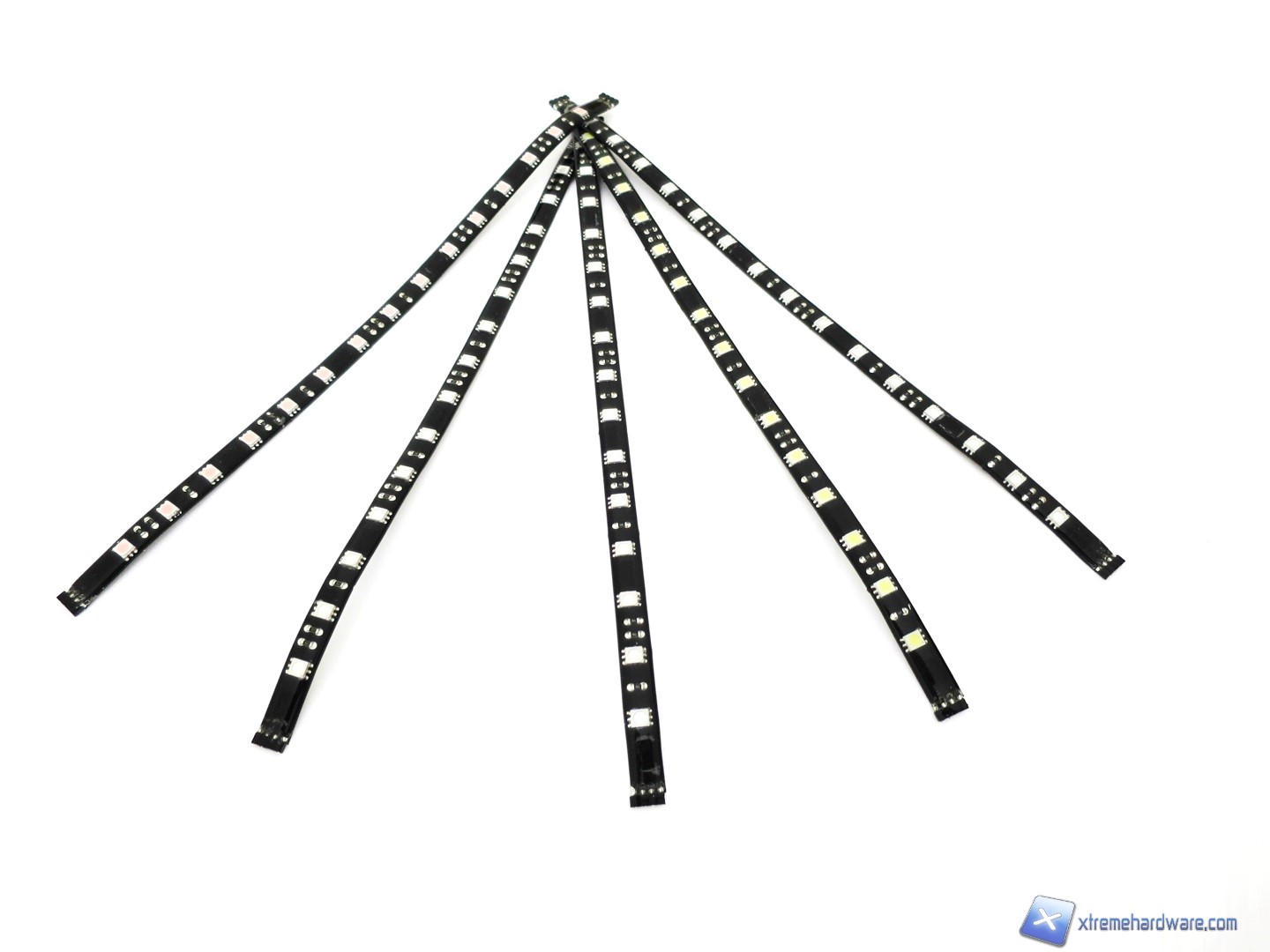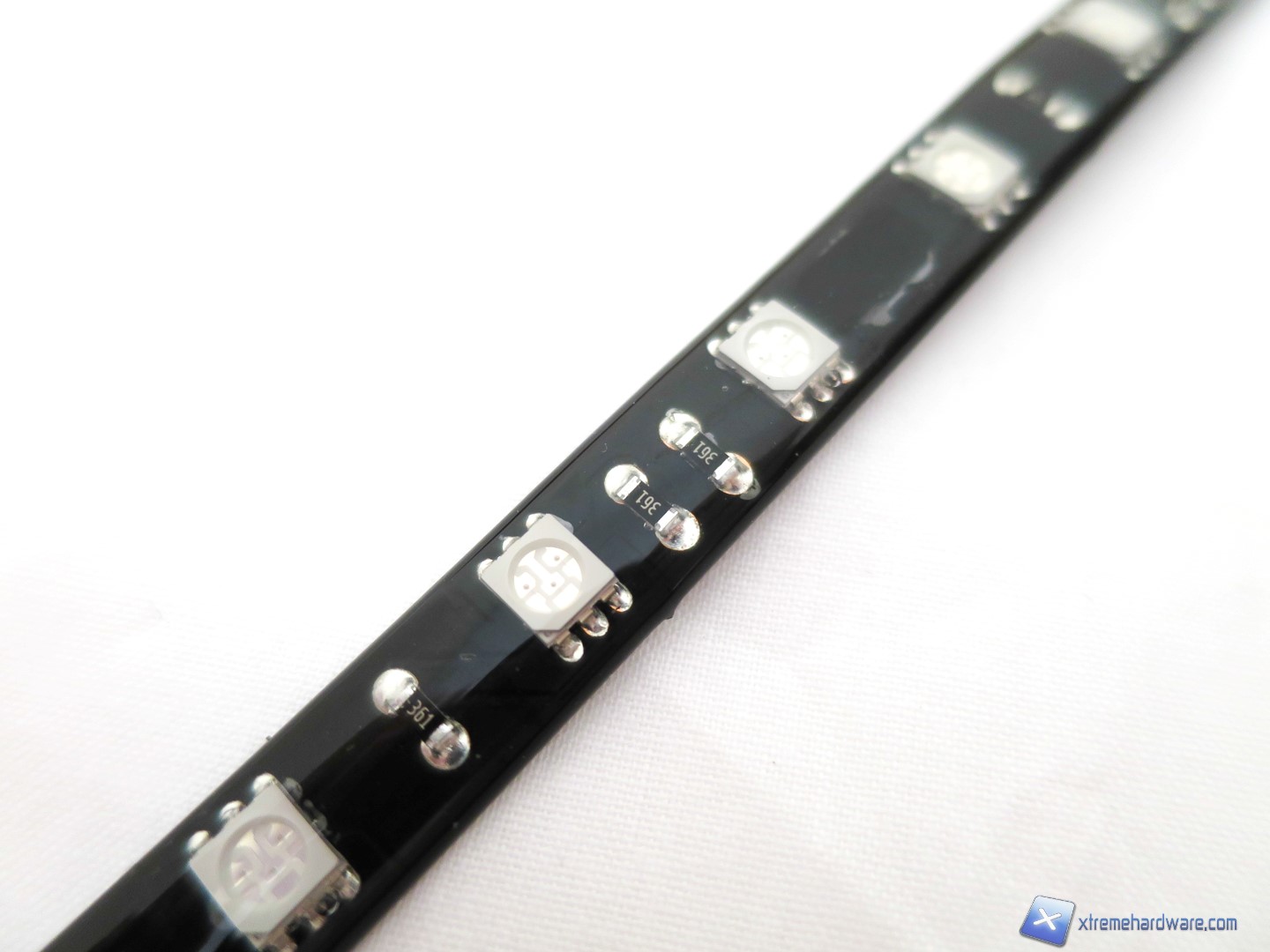Agli estremi di ogni strip troviamo infine due connettori dotati di quattro fori che permetteranno non solo di collegare la singola striscia al connettore Molex con il relativo header ma anche di collegare tra loro più strip per creare diversi effetti di luce o semplicemente per coprire superfici che superano i 60cm, ad esempio contornare una paratia finestrata di un case.
