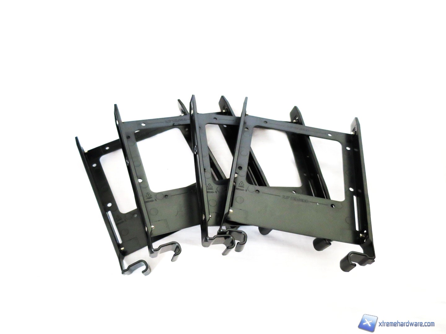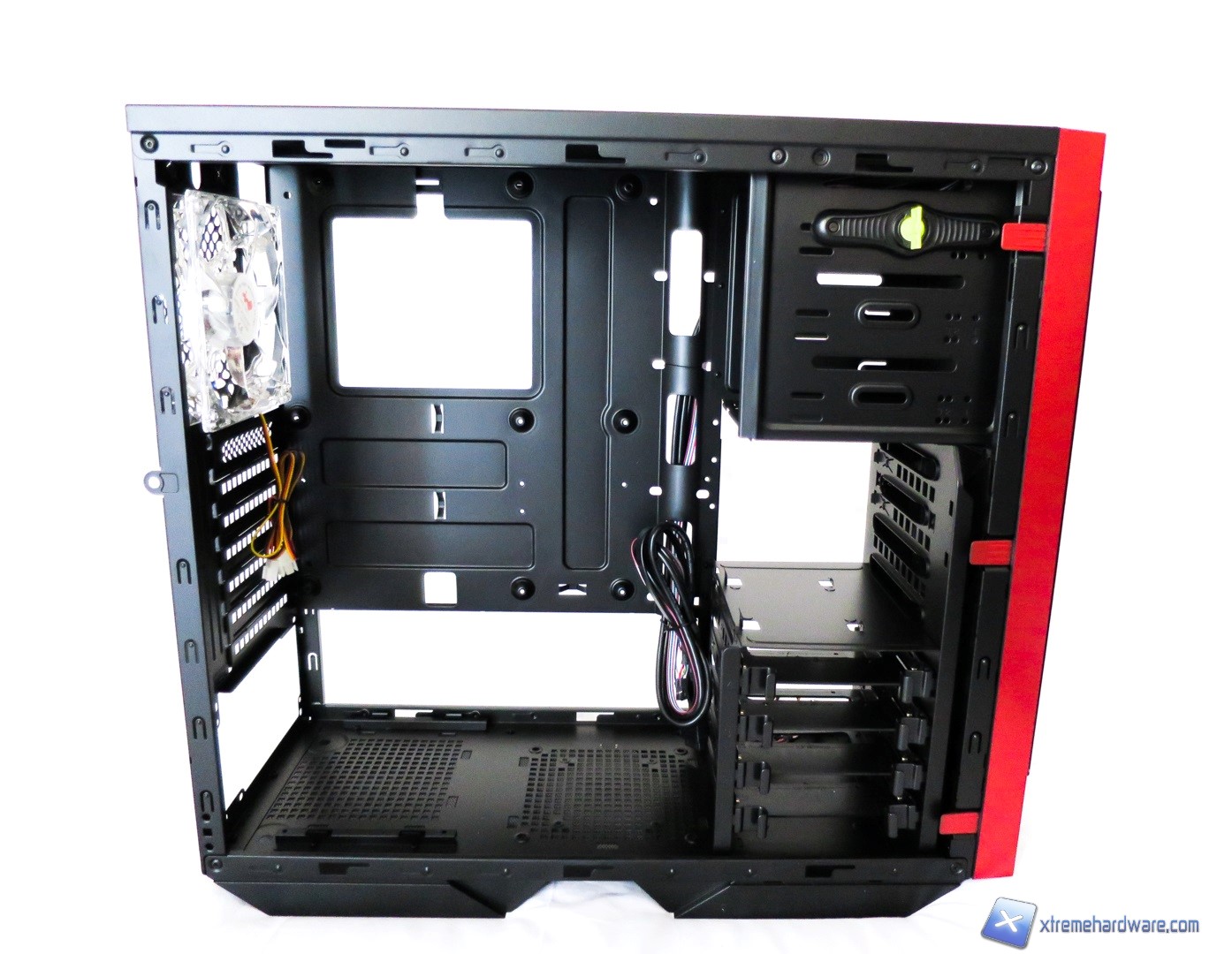 Scendiamo verso il basso dove troviamo finalmente il cage per le unità di storage. Il cage sempre in metallo è caratterizzato da 4 slitte/bay di tipo Tool-Less che ci daranno modo di installare sia drive meccanici da 3,5’’ sia SSD da 2,5’’ grazie ai fori inferiori presenti su ogni singola slitta nonché ad un ulteriore supporto per soli SSD grazie a supporti/fori in metallo nella parte superiore/esterna del cage.