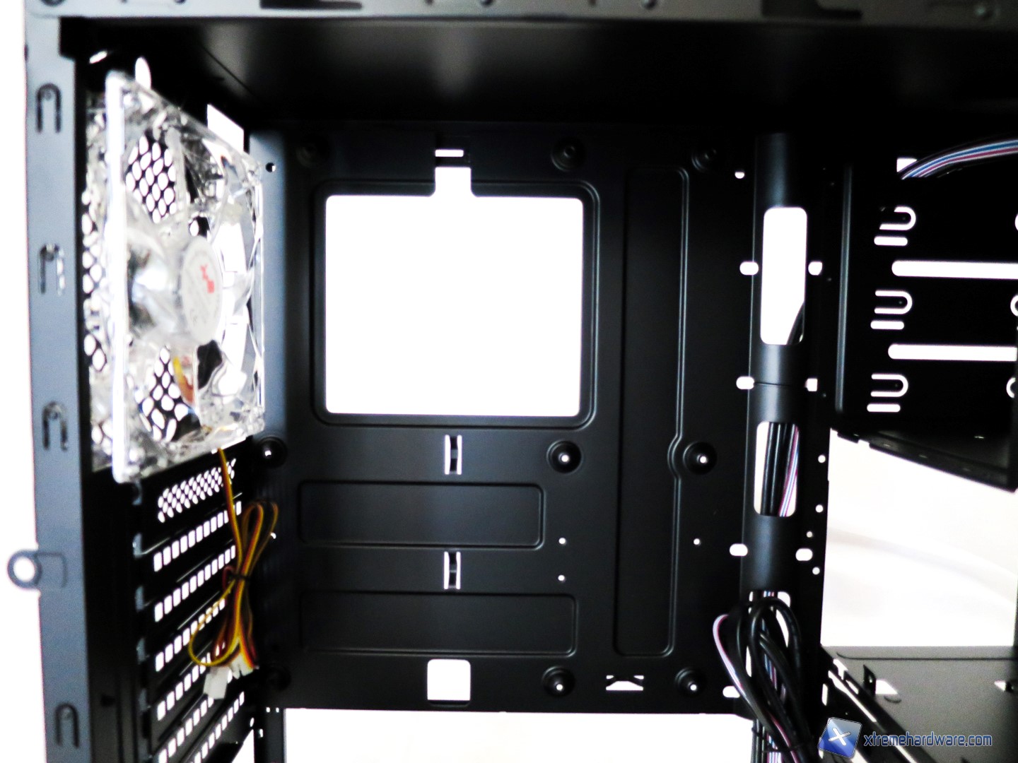 Spostandoci verso la zona inferiore troviamo lo spazio necessario ad installare l’alimentatore e con un adeguato cablaggio anche un’eventuale ventola da 120mm aggiuntiva. Il cablaggio inferiore è in parte agevolato anche da un’apertura orizzontale che darà meglio modo di organizzare i cavi. Ovviamente in presenza di alimentatori più lunghi dello standard ATX l’installazione della ventola non sarà possibile.