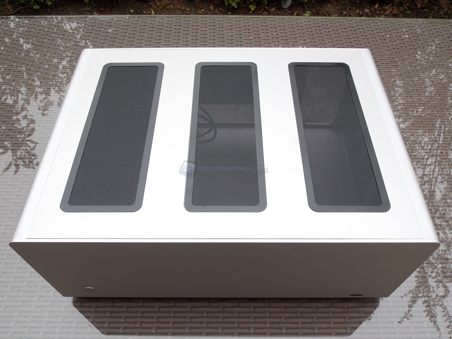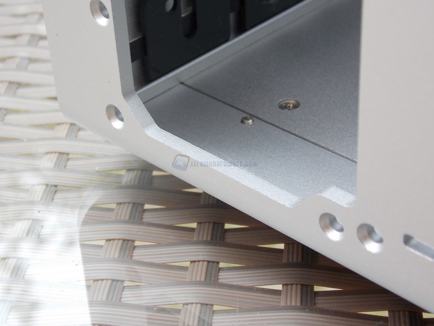 La porzione posteriore è particolarmente elementare, data la predisposizione a sinistra per un alimentatore ATX, ed una scheda madre E-ATX, che supporta quindi fino a 2 schede grafiche in parallelo. Da notare le rifiniture nel punto di inserimento della viteria.