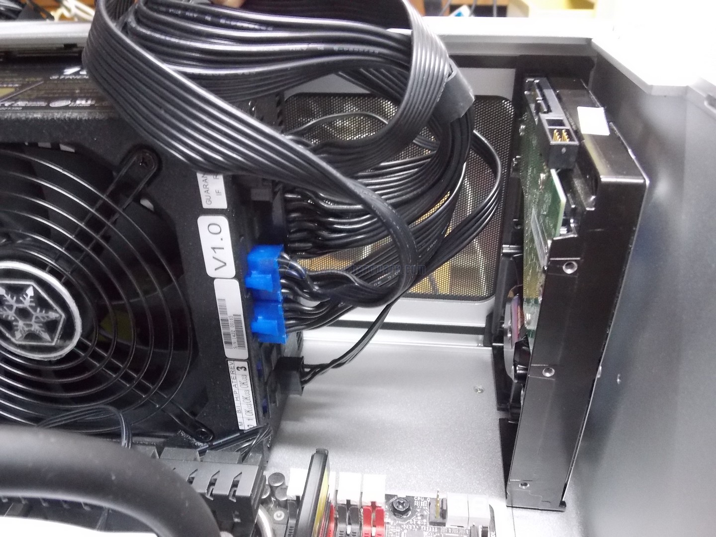 Nell'ultima fotografia potete notare l'orientamento verticale di un hard disk da 3.5" direttamente dietro all'alimentatore da 1500 SilverStone Strider Gold. Sarebbe anche possibile inserire un SSD da 2.5" direttamente dietro il modello da 3.5", installando però una staffa di ancoraggio in posizionamento orizzontale, ancorata a quest'ultimo e fissando l'SSD di conseguenza. Consigliamo caldamente l'adozione di un connettore SATA orizzontale, sullo stile della variante SilverStone utilizzata nel prossimo capitolo dell'assemblaggio. Particolare dei connettori forniti nel case, di accensione e LED HDD. Oltre a ciò possiamo notare le staffe orizzontali, a cui è possibile installare radiatori e ventole, come vedremo in seguito.