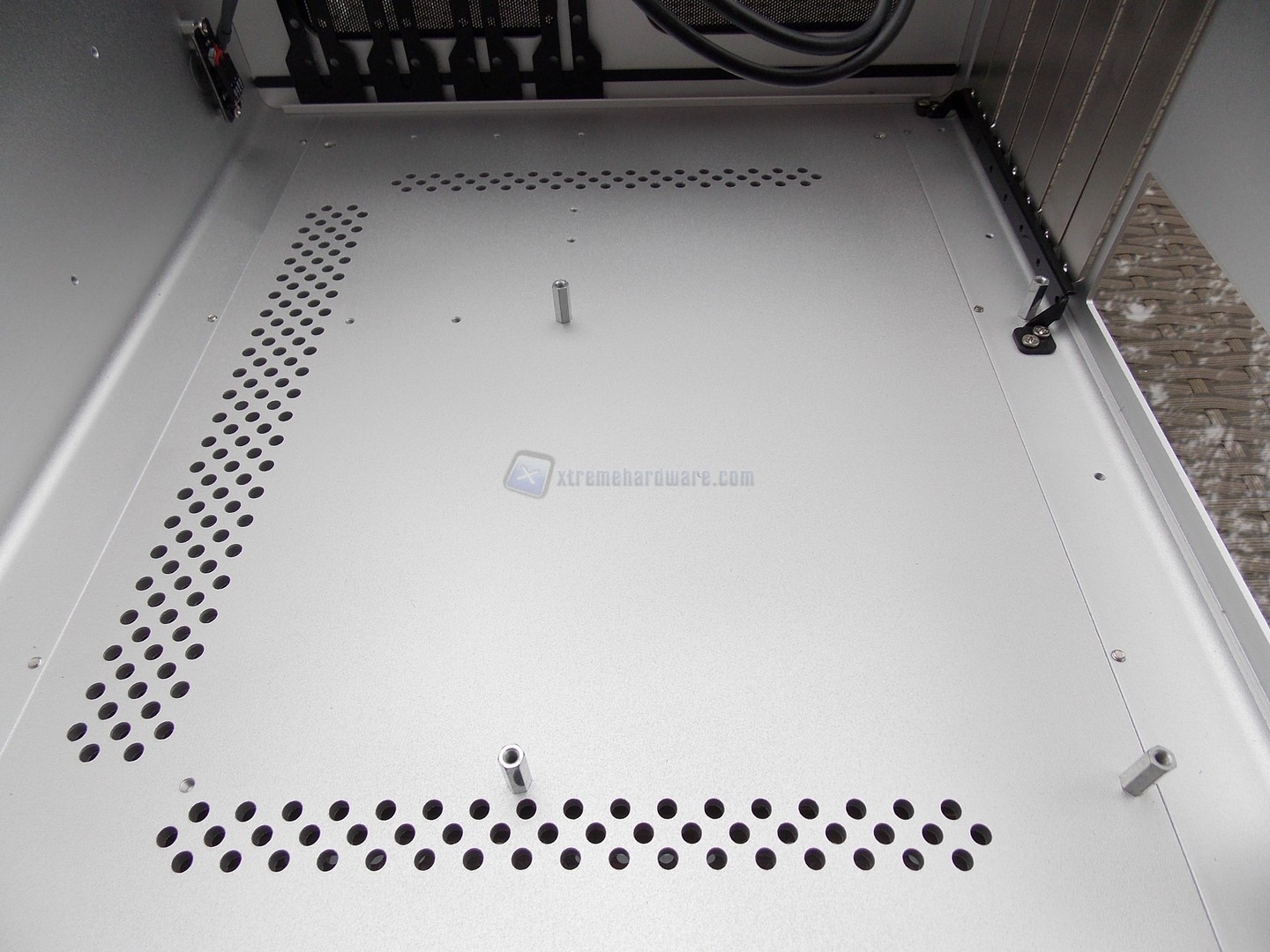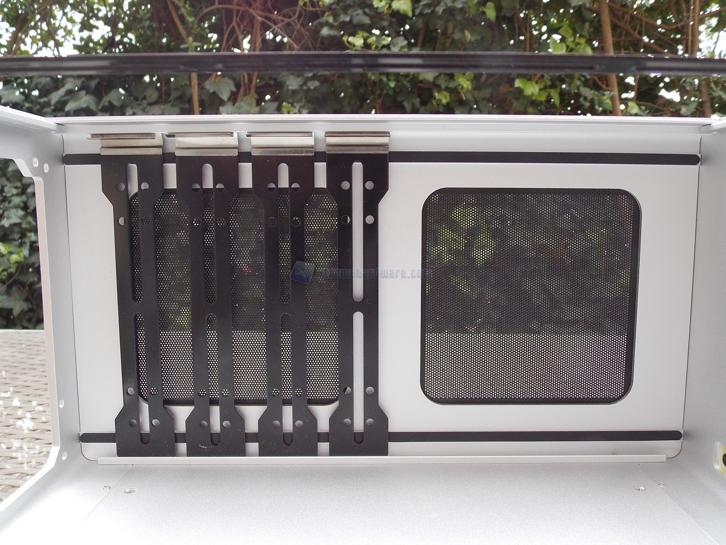 Il piatto della scheda madre è interamente in alluminio e lo spessore è decisamente molto elevato. Il plate della scheda madre è elementare, ricordiamo che è necessario installare gli spacer per il montaggio della stessa sul telaio inferiore. E' possibile installare schede madri fino allo standard E-ATX, senza problemi. Consigliamo però l'adozione di standard micro-ATX. E' possibile installare dissipatori ad aria low profile, ma consigliamo caldamente l'adozione di un dissipatore a liquido AIO avente un radiatore da 120mm, o 240mm.