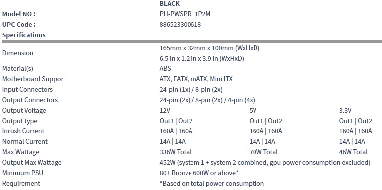 Le specifiche del Power Splitter ci mostrano come non sia un accessorio di poco conto in quanto ci permetterà di trasferire ed erogare ottimi Wattaggi a due sistemi in contemporanea escludendo il consumo di eventuali VGA. Infatti la tabella parla chiaro e potremo erogare un massimo di 452W più che sufficienti per alimentare due schede madri con relativi processori anche in medio OC. Da notare però come sia richiesto come fonte principale minimo un PSU certificato 80Plus Bronze da 600W o più. Nel complesso lo splitter sarà davvero utile grazie ai due comparti Output.