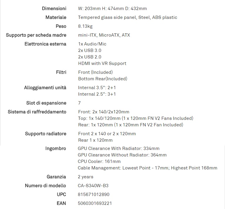 Anche il modello S340 Elite è un case in formato Mid-Tower con supporto a schede madri fino al formato ATX classico. Le tolleranze riportate nelle specifiche sono le medesime dei precedenti modelli come volevasi dimostrate.