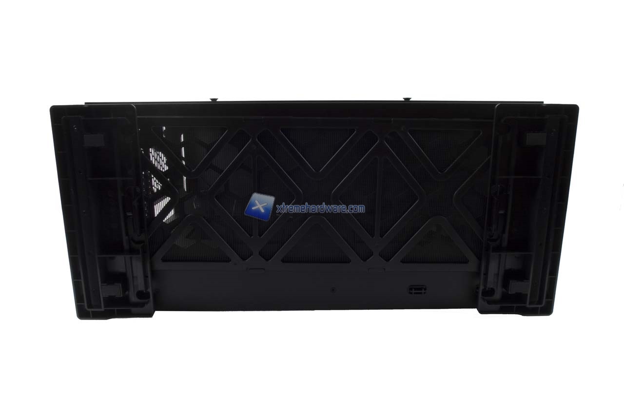 Nel lato inferiore troviamo invece due piedini in plastica di medie dimensioni a fungere da base stabilizzante per il case e centralmente il filtro antipolvere removibile in corrispondenza dei fori per l’installazione nella parte inferiore di un radiatore da 360 mm o tre ventole da 120 mm.