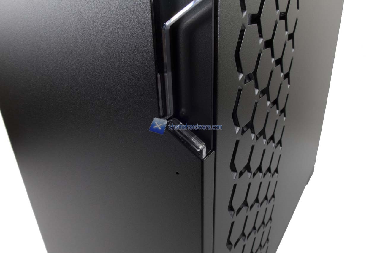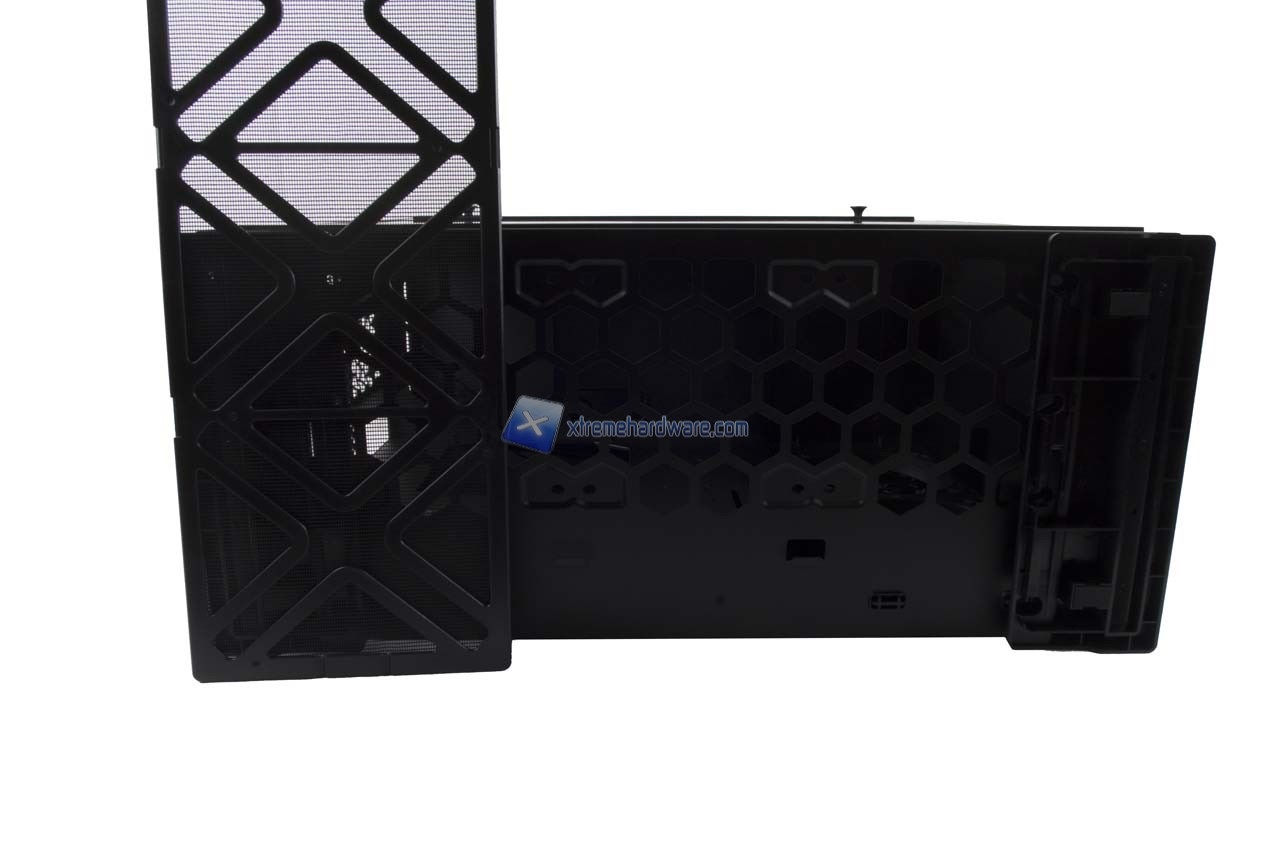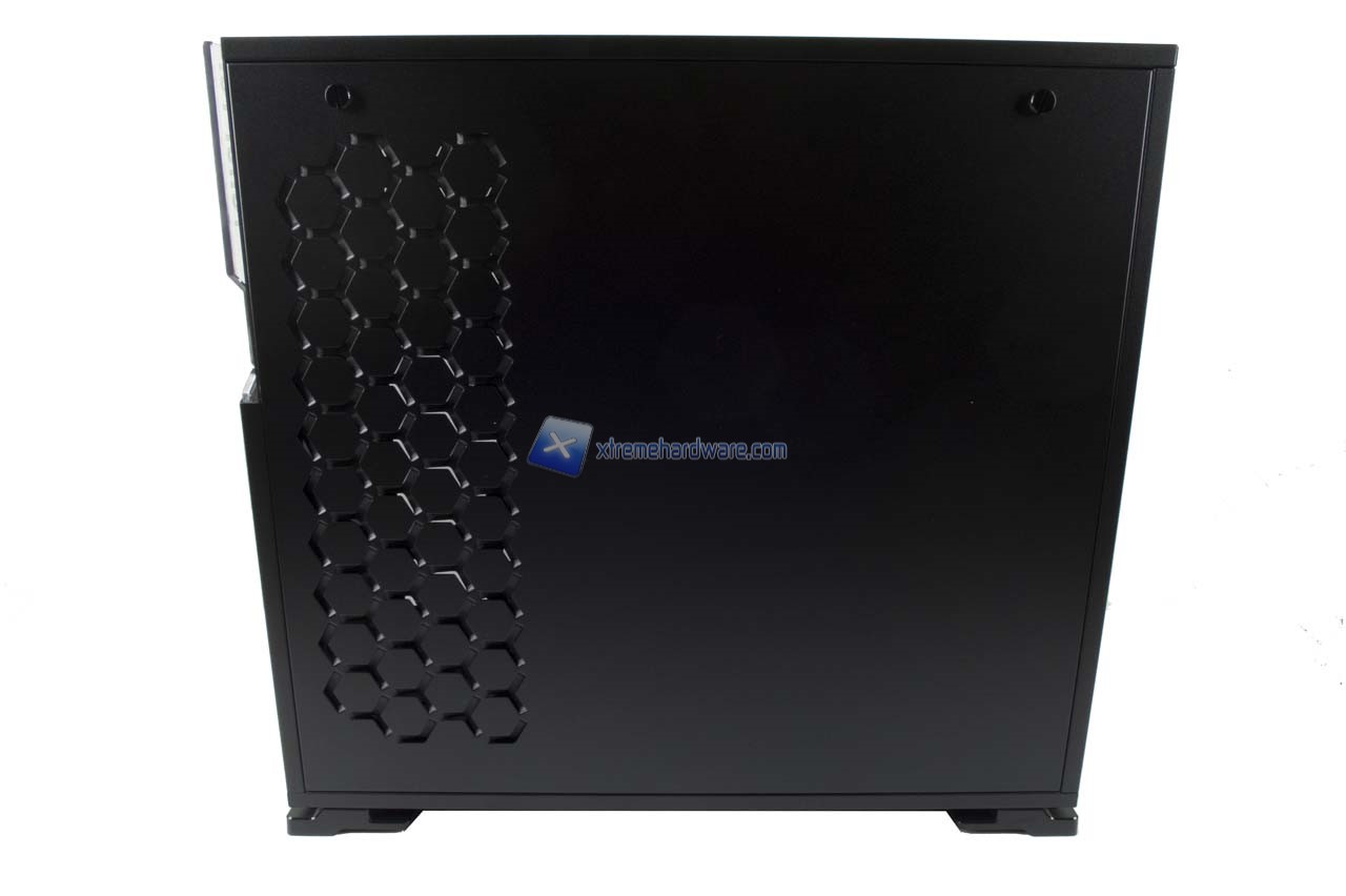 Il pannello di destra mostra il classico design esagonale. Fori posizionati in corrispondenza del supporto per due ventole da 120 mm e/o radiatore da 240 interno.