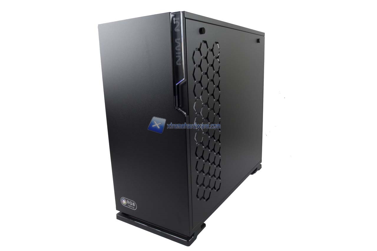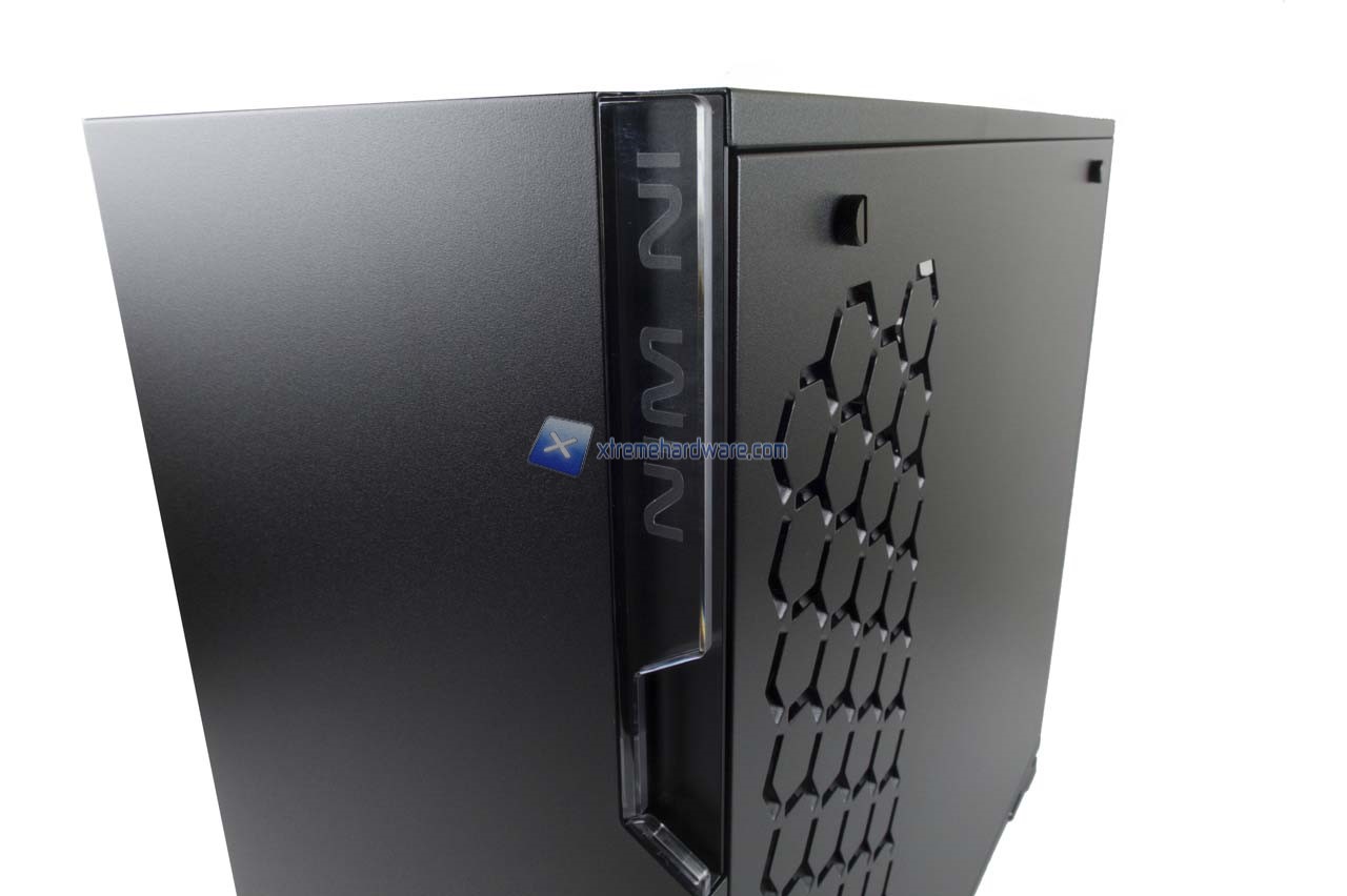 Il pannello frontale rigorosamente chiuso mostra nella parte alta laterale l’inserto in plexyglass con la serigrafia del logo In Win. Questo inserto sarà retroilluminato da un’illuminazione di tipo RGB garantita collegando il cavo interno all’Header della scheda madre.