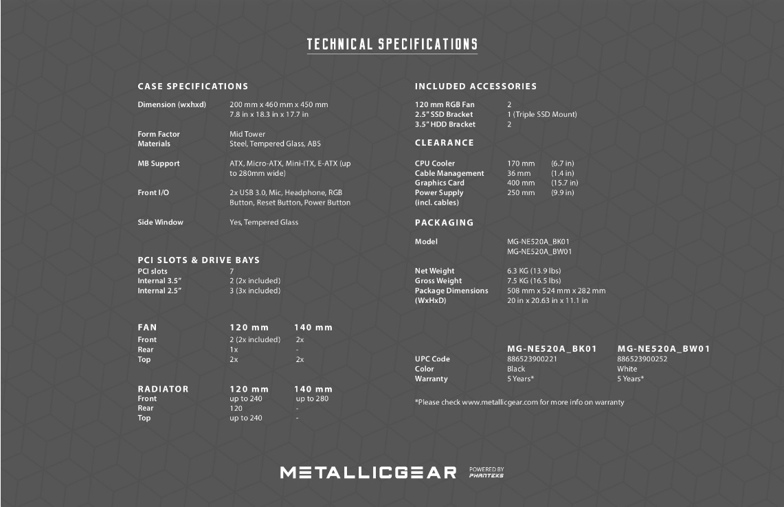 Metallic Gear è il nuovo sub-brand di Phanteks. Con sub-brand non si deve intendere economico o bassa qualità, anzi, ma semplicemente un brand di prodotti parallelo a quello che già Phanteks ha ‘’imposto’’ come standard nel mercato dei case. Una breve descrizione e focus del brand Metallic Gear è possibile comprenderla da questa frase: ‘’ At Metallic Gear we strive to provide a striking balance between form and function in our designs, all products are designed with a contemporary, streamlined aesthetic to ensure that years on they retain a cool and sophisticated presence in your home.’’