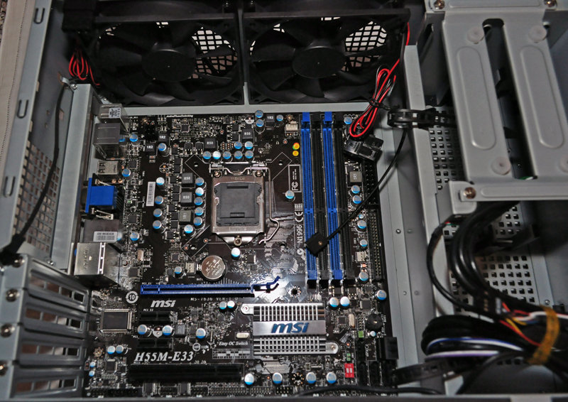 Ecco qui il case come si presenta dopo aver montato 2GB di Apacher DDR3 2000Mhz CL9, un Core i5 750 @ 2.66Ghz su una MSI H55M-E33. Come lettore dvd abbiamo usato un Samsung Sata e come HDD un Maxtor da 80GB. Non ci resta che andare a montare la scheda video. Per il montaggio degli HD basta rimuovere la staffa, togliendo le viti, inserire l’HD, serrare con ulteriori viti ed infine rimontiare la staffa. Per montare il lettore bisogna invece rimuovere la gabbia a sgancio rapido e inserire il drive nell’apposito vano, infine rimettiamo la gabbia per unità da 5.25’’ nel suo alloggio.