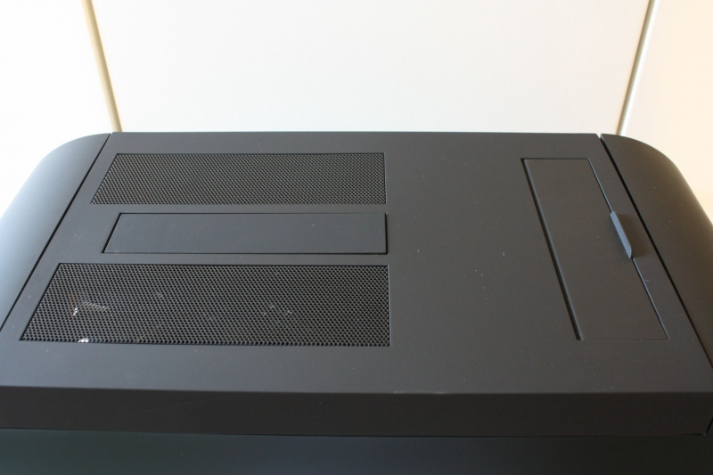 Nella parte superiore è istallato uno sportellino in plastica: una volta aperto mostrerà i di pulsanti e le connessioni esterne, ovvero il tasto power, quello per il reset, il pulsante per spegnere i led delle ventole, 2 porte usb3.0, due porte usb 2.0, una porta e-sata, l'ingresso per le cuffie ed il microfono, i led di stato e di funzionamento.