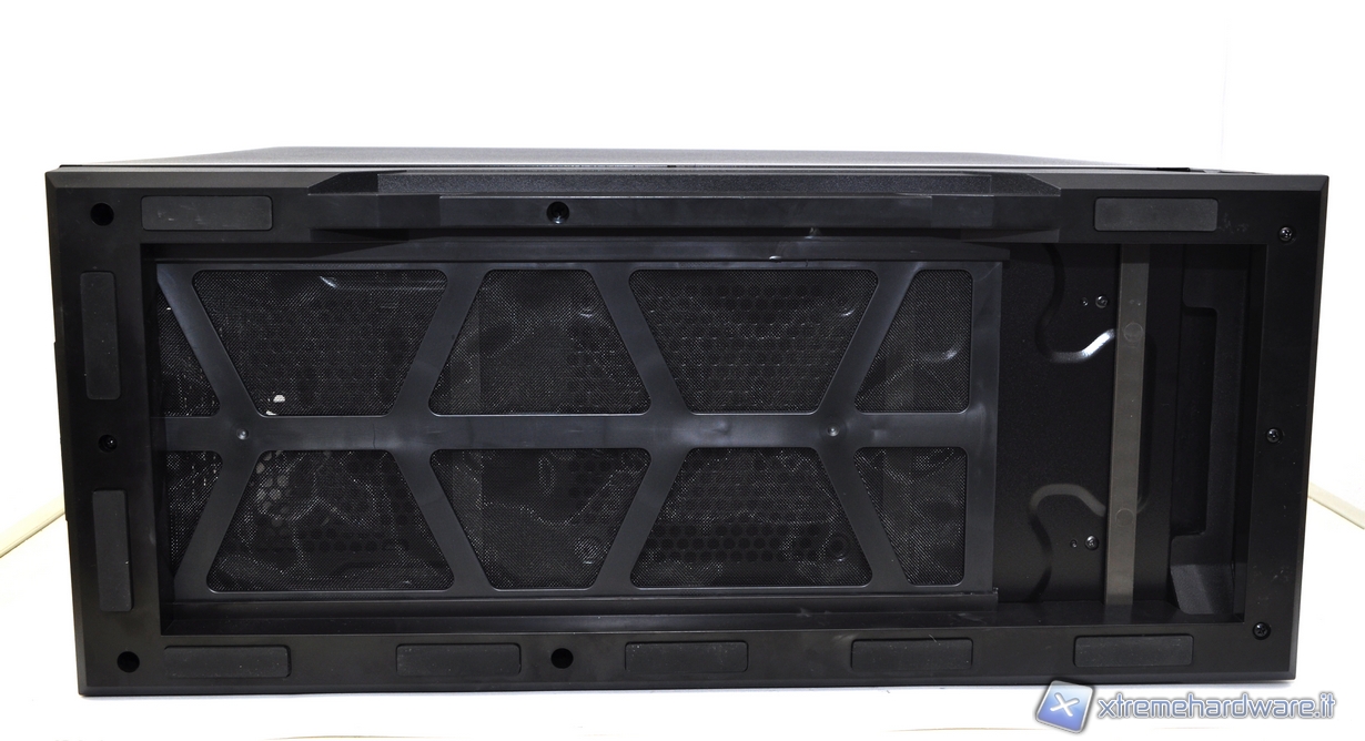 La base offre la possibilità di montare una ventola da 120mm sul fondo in immissione. A fianco troviamo la griglia destinata all’alimentatore che consente di installarlo in modo tale da aspirare l’aria dall’esterno. Questa soluzione farà si che il flusso d’aria che circola all’interno dell’alimentatore, sia completamente indipendente da quello del resto del pc. D’altra parte per chi pensa di avere troppa polvere alla base del case, con il rischio di intasare velocemente il filtro, potrà disporre l’alimentatore in modo tale che prenda aria dall’interno, ovvero con la ventola rivolta verso l’alto. Sempre sul fondo troviamo una griglia rimuovibile che consente di catturare la polvere, questa può essere estratta facilmente visto che è installata in un cassetto scorrevole. Grazie ai suoi 9 gommini antiscivolo installati alla base, il case rimarrà ben saldo e stabile sulla superficie dove sarà collocato.