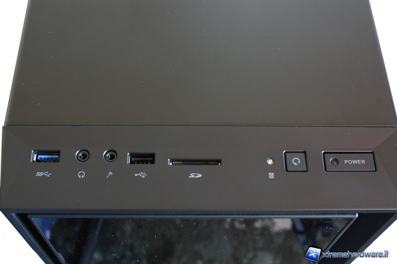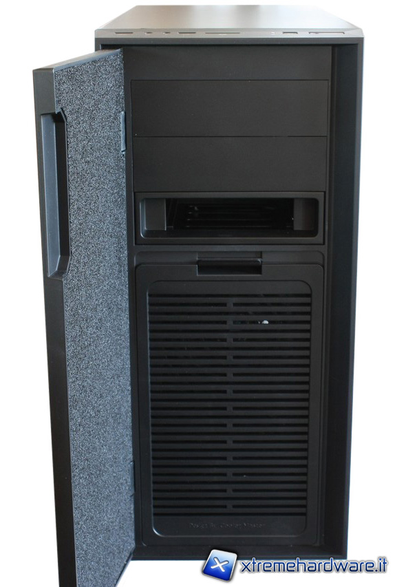 La sezione frontale incorpora uno sportello con un meccanismo di chiusura magnetico. Una volta aperta la paratia,possiamo notare che è presente del materiale fonoassorbente per ridurre il rumore generato dalle ventole frontali.