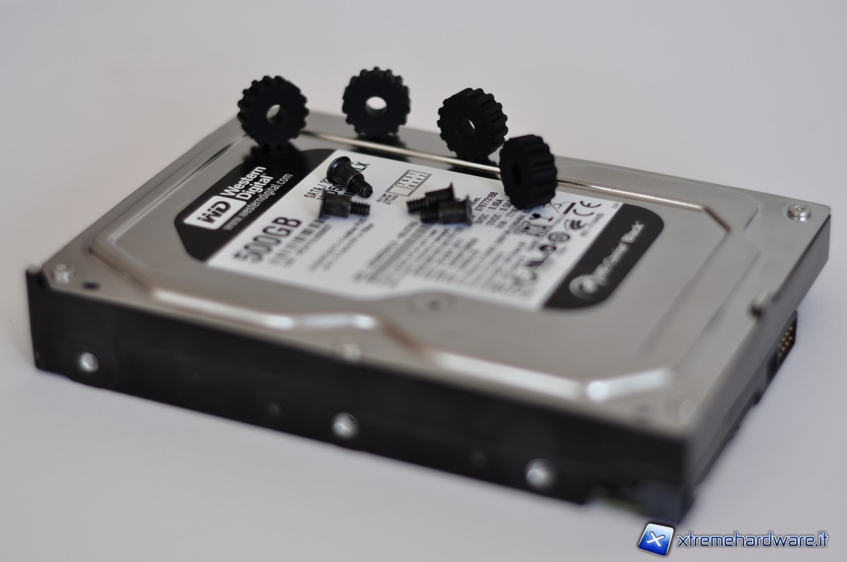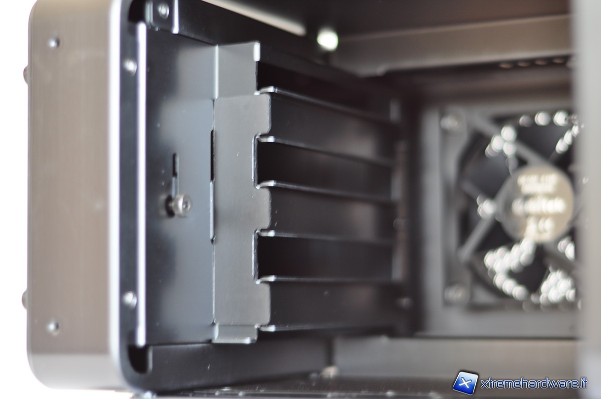 L’interno presenta delle guide per supportare il montaggio di 3 hard disk da 3.5”. Il sistema di montaggio degli hard disk è piuttosto curioso ed pratico. Nel bundle sono presenti 12 gommini a forma di ruota e delle apposite viti con distanziale. Si montano questi gommini per mezzo delle viti sull’hard disk, poi basta far scorrere i gommini sulle rotaie. Basterà poi far scivolare la piastrina basculante allentando l’apposita vite per poi rifissarla in maniera tale da serrare gli hard disk e il gioco è fatto. I gommini garantiscono l’assorbimento delle vibrazioni riducendo il rumore prodotto dal sistema. Sul pannello frontale è presente una ventola da 80 mm con filtro antipolvere dedicata al raffreddamento del modulo. Gli hard disk, grazie alla distanza tra i vari slot, possono davvero trarre giovamento da questo sistema di raffreddamento. Unico neo è che questa ventola dal diametro ridotto risulta un po’ rumorosa.