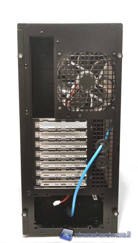 La parte posteriore del case presenta a sinistra l’apertura per la mascherina I/O della scheda madre e a destra una griglia con installata una ventola da 120mm che ha il compito di espellere l’aria calda all’esterno del case. Notiamo come la ventola sia installata con l’ausilio di quattro gommini anti-vibrazione e non con le classiche viti come in molti prodotti che si collocano su questa fascia di prezzo. Ottima anche questa scelta di Sharkoon al fine di minimizzare il rumore.