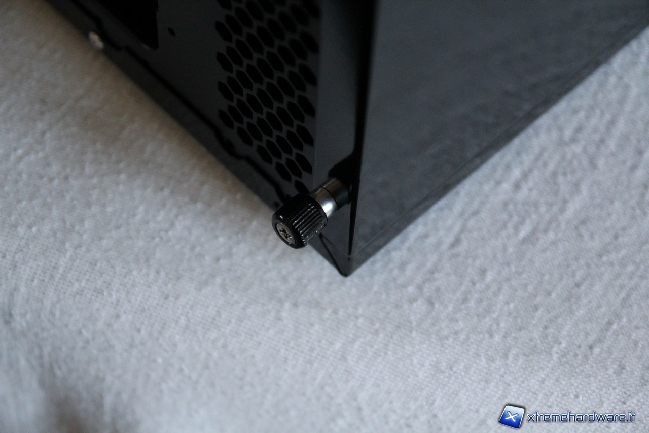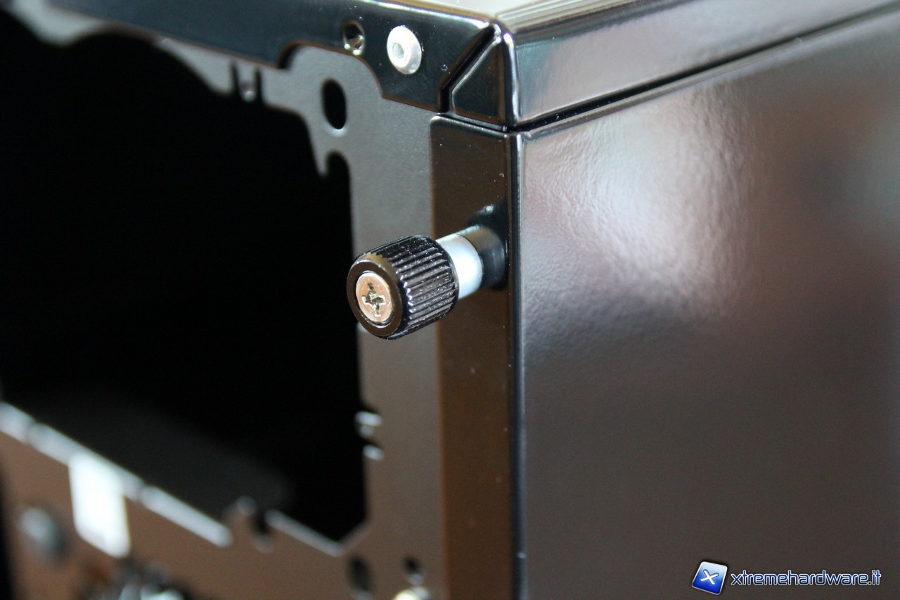 I pannelli laterali non presentano finestre o griglie di aereazione, la loro verniciatura è perfetta e priva di imperfezioni. Particolare attenzione va al pannello sinistro che utilizza delle viti a pressione che rimangono attaccate al pannello stesso una volta rimosso. Esso incorpora inoltre un sistema di sicurezza composto da due anelli nel quale potremmo apporre un lucchetto per impedire l’accesso al nostro hardware interno.