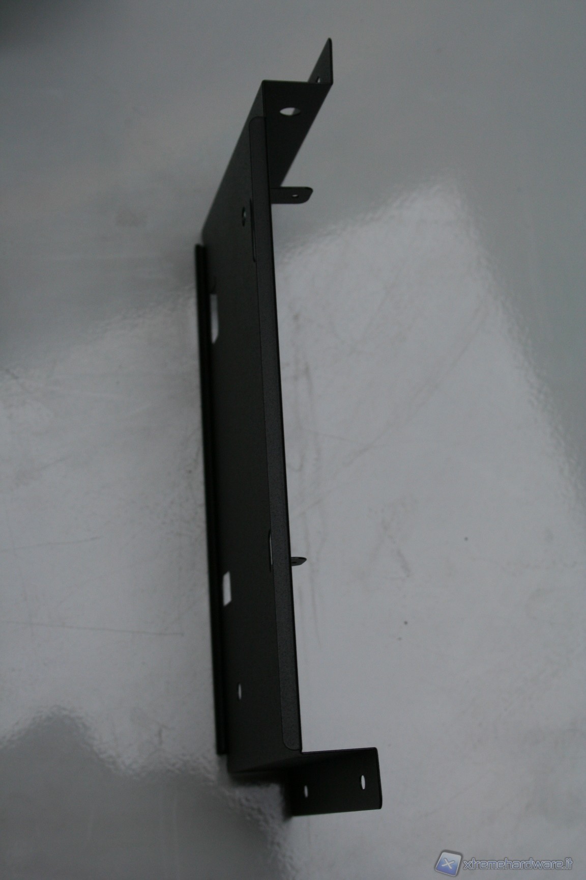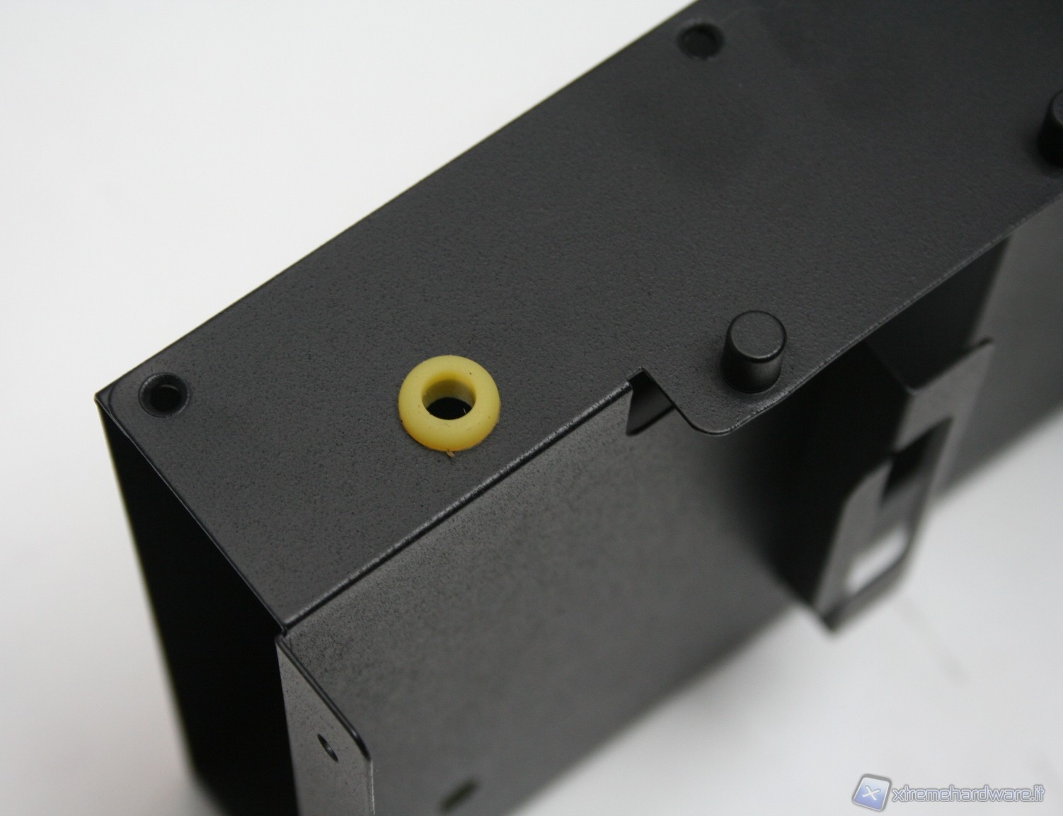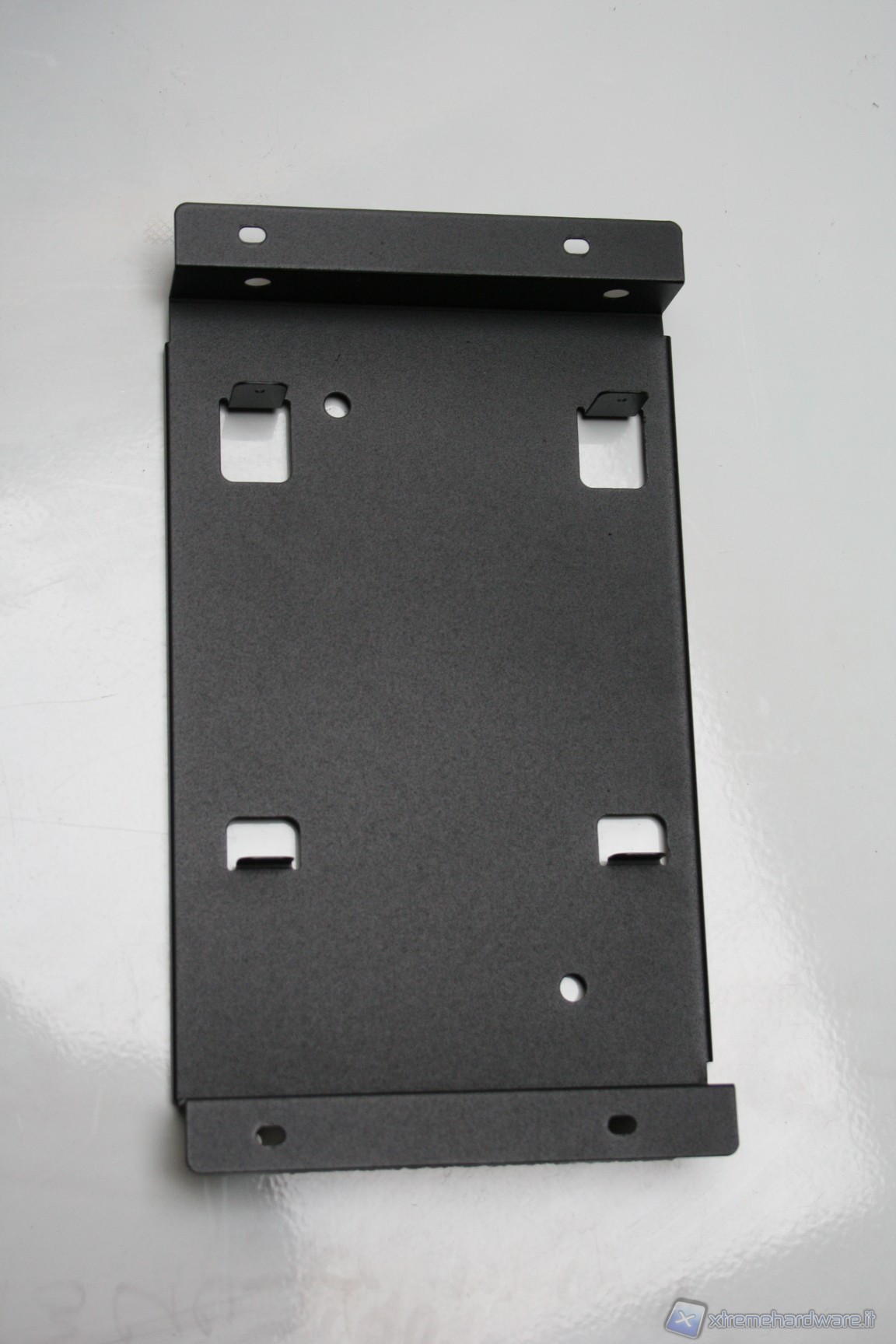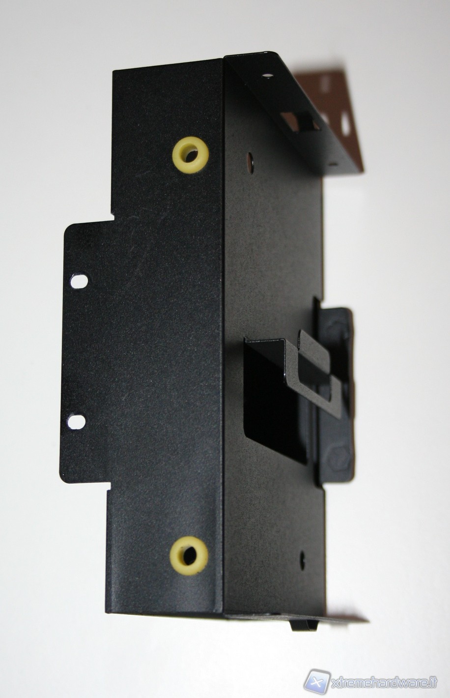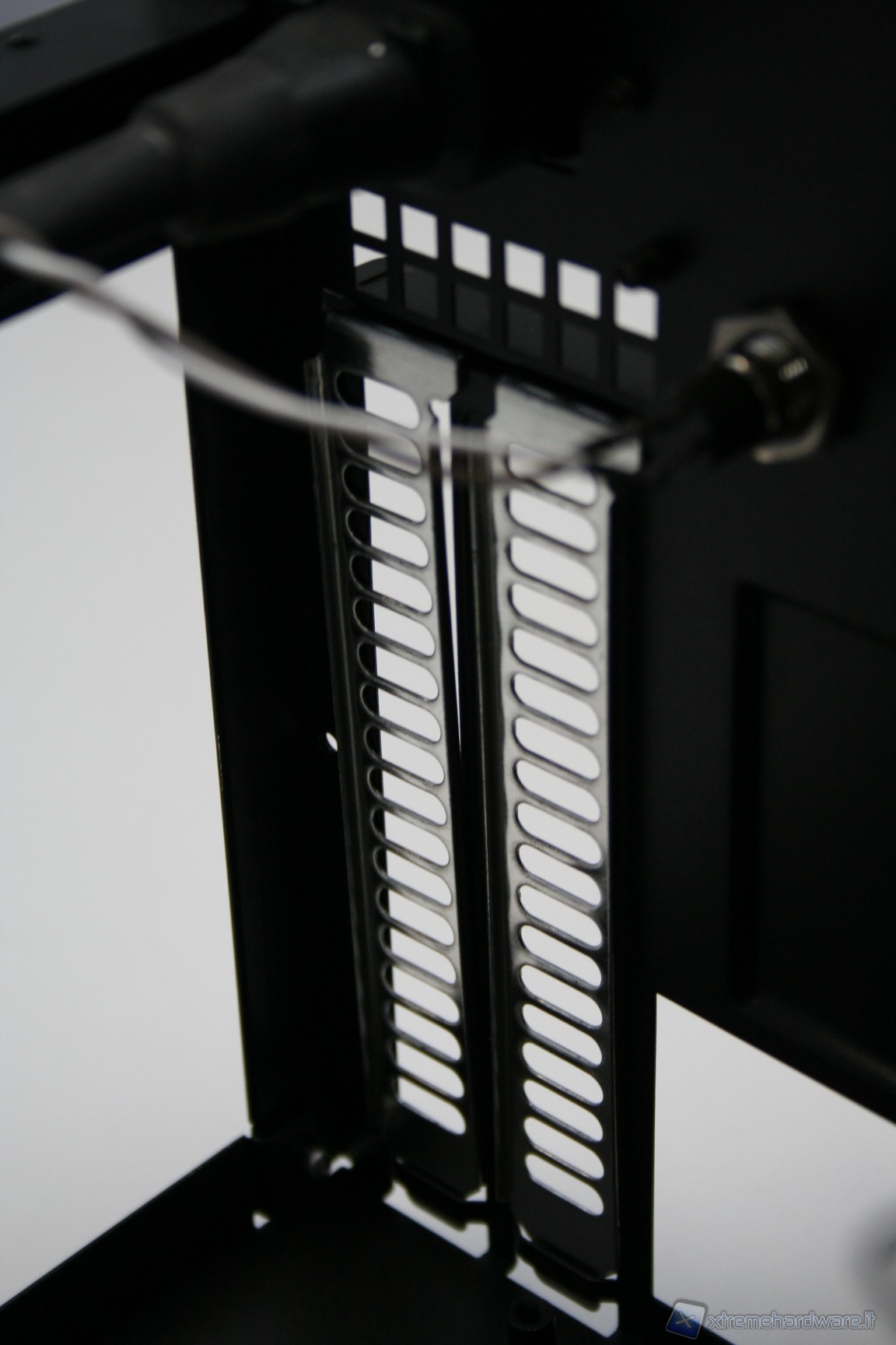 Rimossa la paratia laterale e superiore, che forma un corpo unico, possiamo subito notare la peculiare struttura interna. E’ immediatamente visibile il grande filtro antipolvere della ventola da 180mm, facilmente rimovibile tramite un sistema a scorrimento. Guardando più avanti si nota un alloggiamento per due SSD o hard disk da 2.5”, rimovibile tramite delle semplici viti. Eliminando questo alloggiamento possiamo installare un hard disk da 3,5”, all’interno dell’unico bay predisposto, e dotato di profili gommati antivibrazione. Rimuovendo sia l’alimentatore, sia i bay dei dischi, ci rendiamo conto di quanto in realtà lo spazio possa esser stato ottimizzato e studiato. Da notare il cavo di alimentazione che parte dalla porzione inferiore destra, frontalmente, e termina, mediante fascettatura tramite linguette metalliche, all’estremità posteriore sinistra, in alto. Il meccanismo di fissaggio dell’unica ventola da 180mm è ad incastro, e la rimozione è davvero facile. Molto caratteristico anche il sistema di bloccaggio delle periferiche addizionali, quali ad esempio la scheda video. E’ necessario smontare delle viti nella porzione posteriore, smontare poi i due bracket ed infine rimontare tutto, di modo che si blocchi automaticamente. I bracket sono inoltre ventilati.