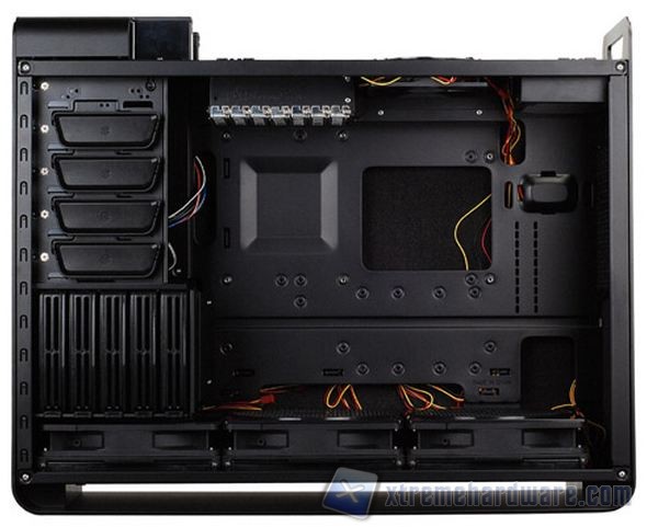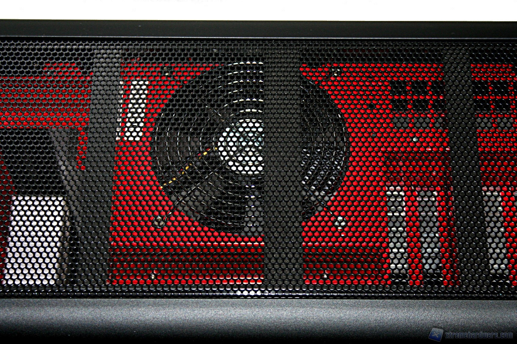 Non è presente la ventilazione frontale per come siamo abituati a concepirla, similmente al TJ04-Evolution, ma data la presenza di ben tre ventole da 180mm inferiori e dato il posizionamento ruotato della scheda madre, non ce ne sarà bisogno. I dischi rigidi possono essere raffreddati dalla prima ventola AP181, che oltre ad essere settata in immissione, permette di aumentare l’aerazione anche nel comparto frontale del cabinet, evitando ristagni di aria calda.