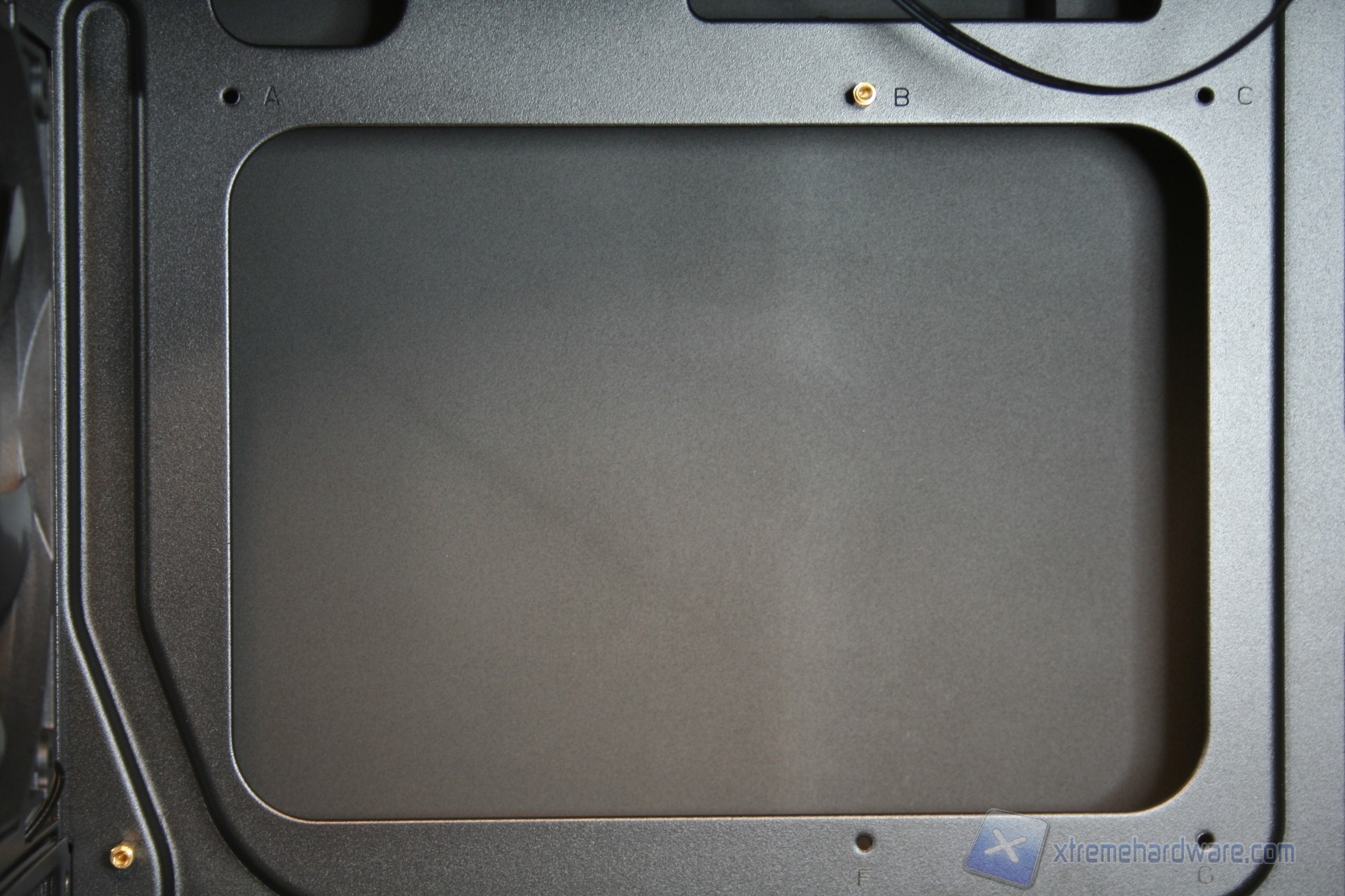Il piatto della scheda madre è interamente in acciaio e diversamente da alcuni modelli di cabinet top di gamma degli anni passati non è removibile. La qualità, la robustezza e lo spessore sono tanto evidenti quanto di livello e sono presenti 8 guaine in gomma antitaglio, la cui stabilità risulta essere davvero elevata, e quindi non ci sarà nessuna fuoriuscita delle stesse, dagli incavi, all’atto del passaggio dei cavi. Nella parte superiore sono presenti due grandi aperture per il passaggio dei cavi, molto pratiche per via della dimensione, ed oltre a questo ovviamente è presente l’apertura del piatto della scheda madre. Abbiamo apprezzato in particolar modo la grandezza del foro, nella parte superiore sinistra, dove sarà possibile far passare il connettore di alimentazione ausiliario della scheda madre da 4/8pin, in quanto non ci sarà nessun problema all’atto del ripiegamento dello stesso, per inserirlo nel corrispettivo connettore di alimentazione della scheda madre. La fessura d’installazione per il backplate posteriore è decisamente grande e permetterà tranquillamente il montaggio di dissipatori particolarmente complessi. Lo spazio tra la scheda madre e la ventola superiore da 200mm è leggermente superiore allo standard ma notifichiamo che questa ventola, o ventole alternative, sarà possibile posizionarle sopra alla paratia di acciaio di bloccaggio, aumentando quindi lo spazio in questo settore. Questo implica che la procedura di assemblaggio sarà facilitata, che non ci sarà nessun problema durante il montaggio di dissipatori particolarmente grandi oppure di un radiatore da 240mm ad elevato spessore nella parte superiore. Posteriormente si hanno ben dieci aperture dove inserire fascette restringenti, il che permette un livello di pulizia e di ordine elevatissimo. Oltre a ciò, sarà possibile montare un radiatore da 240mm in posizione superiore, oppure un radiatore da 120/140mm con spessore doppio nella parte posteriore, al posto della ventola preinstallata. Affronteremo meglio le possibilità di integrazione a liquido in un capitolo separato.