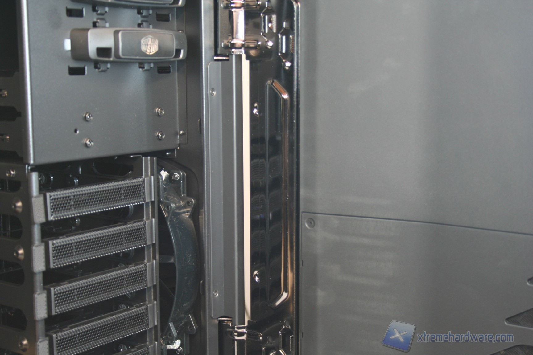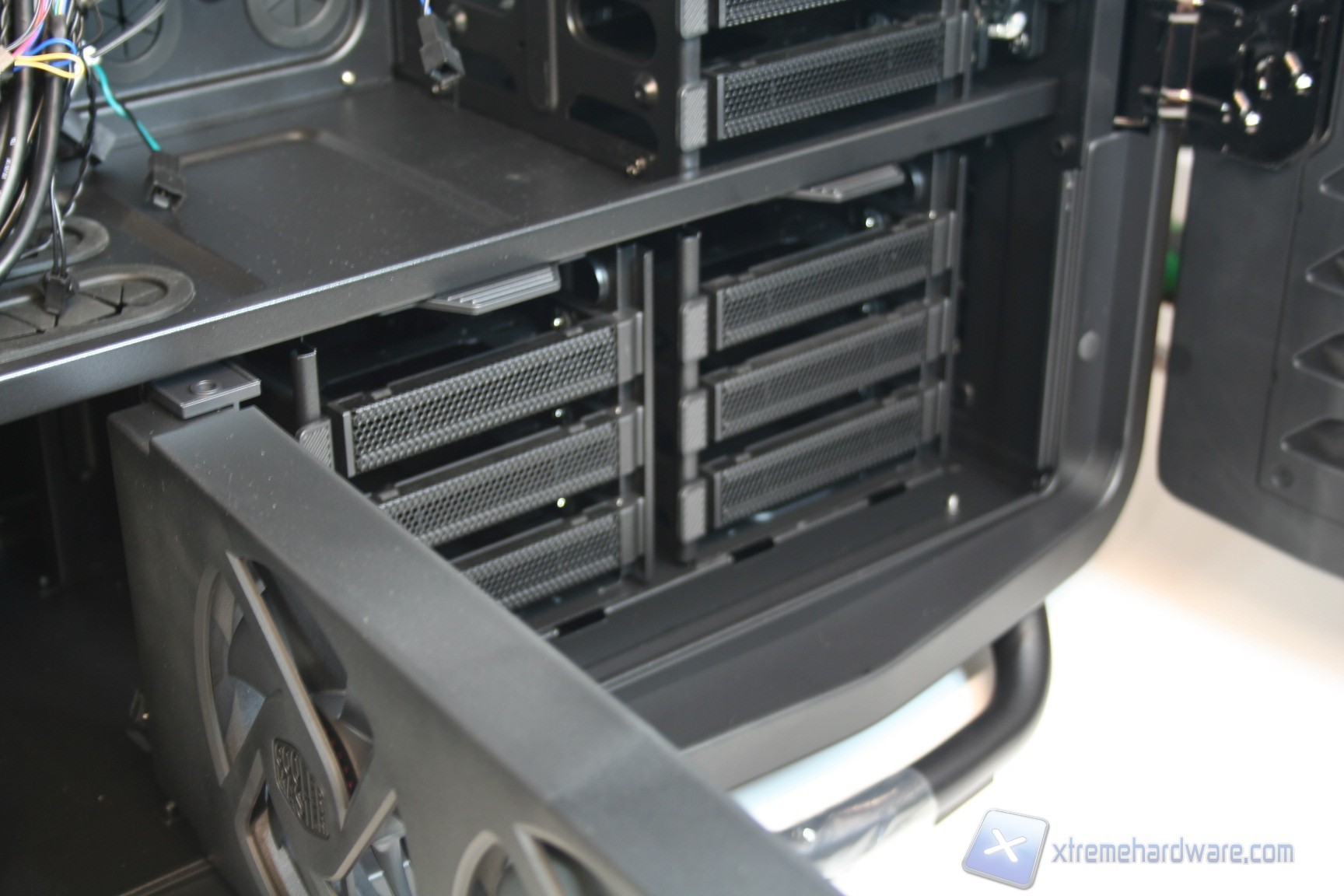 Il layout, sebbene presenti alcune ricercatezze, è simile allo standard in quanto l’orientamento della scheda madre è classico ATX, il posizionamento dei bay per gli hard disk è nella parte frontale, identico quello delle periferiche da 5.25” ed è anche identico quello dell’alimentatore inferiore, sebbene però sia presente la separazione in due scompartimenti, tesa ad isolarli a livello termico. Si è scelto di procedere in questo modo anche per via della presenza di ulteriori 6 bay per hard disk nella parte inferiore e frontale, che però vengono raffreddati da un pratico ed efficiente sistema dedicato di ventilazione comprendente due ventole da 120mm, che pescano aria da fessure dedicate nella paratia laterale.