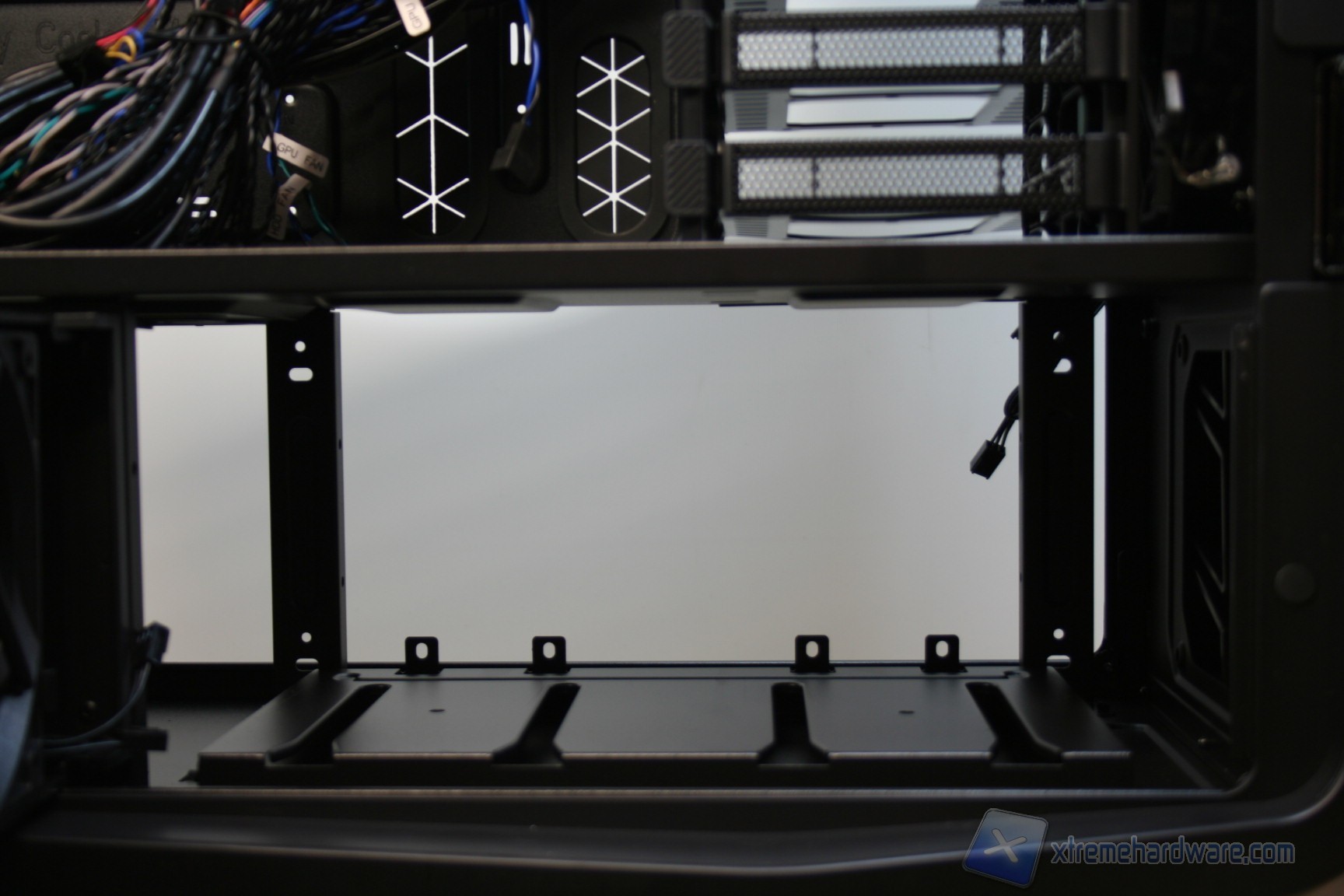 Nella parte inferiore invece sono stati installati due cage, removibili grazie a semplici viti di ancoraggio, che permettono l’installazione di altri 6 hard disk e che ne permettono la ventilazione grazie a due ventole da 120mm preinstallate, le quali vengono connesse direttamente al sistema di regolazione nel pannello superiore. Questo sistema permette la regolazione della ventilazione interna, e conseguentemente sia della rumorosità che delle temperature. Ovviamente questo supporto per le ventole può essere aperto grazie ad una levetta, tramite un movimento orizzontale di 90 gradi in senso orario, ma può anche essere rimosso qualora fosse inutile, o qualora dovesse servire uno spazio maggiore.