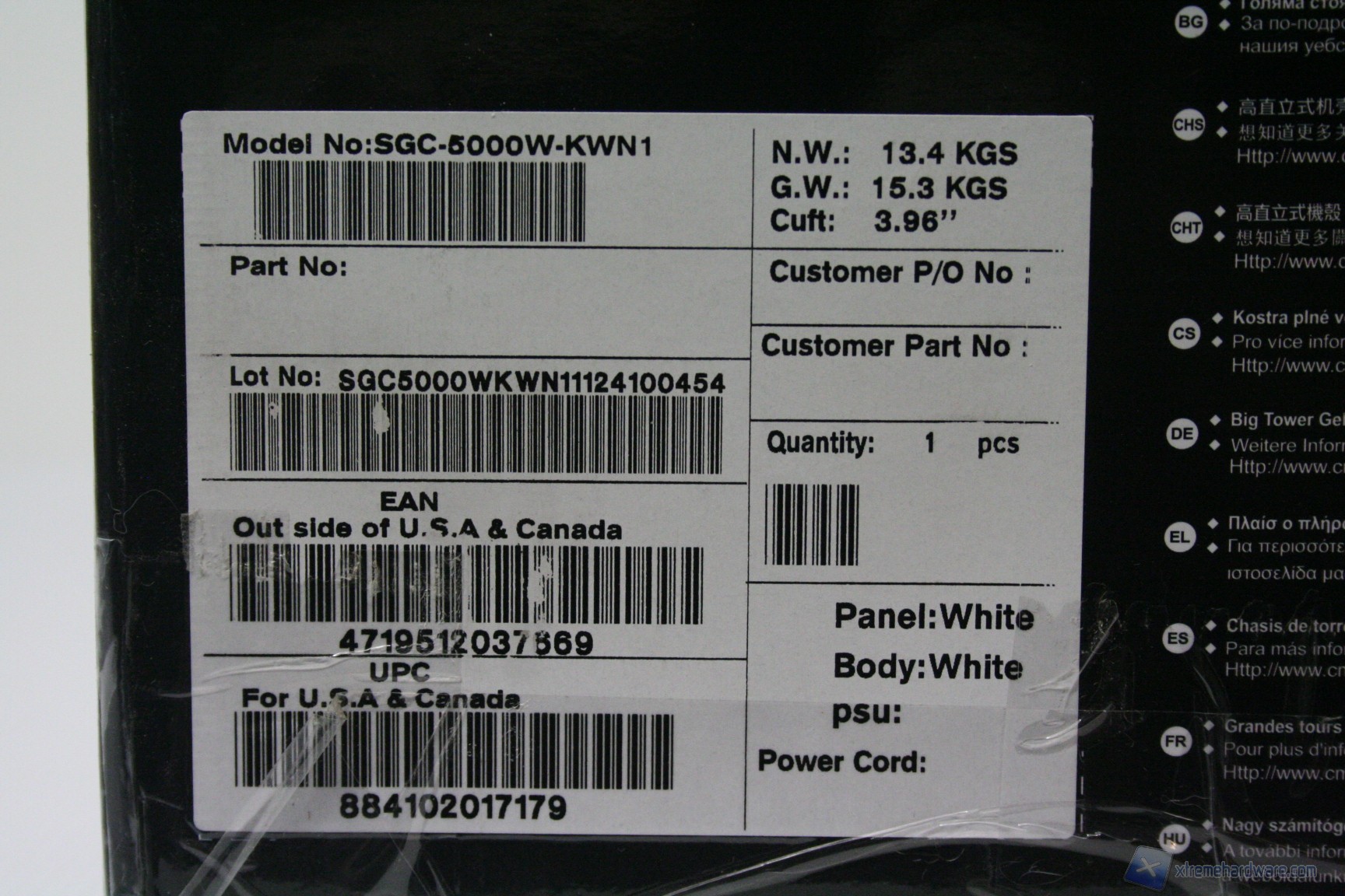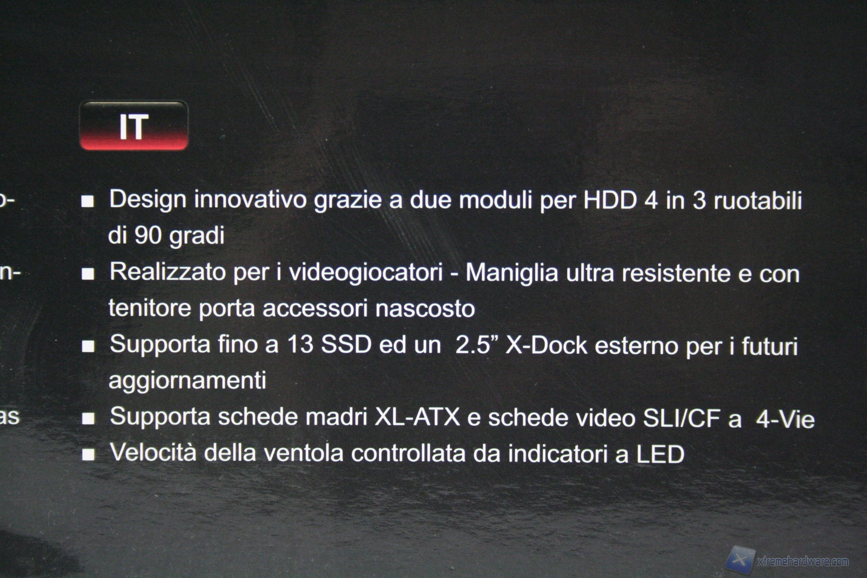 La confezione è molto valida, stile CM Storm, con un ottimo numero di informazioni ed un valido imballo interno, caratterizzato da due distanziatori di polistirolo, più la classica busta di plastica antigraffio, oltre alle plastiche di protezione specifiche per il pannello laterale e ad inserti in plastica nella parte superiore.