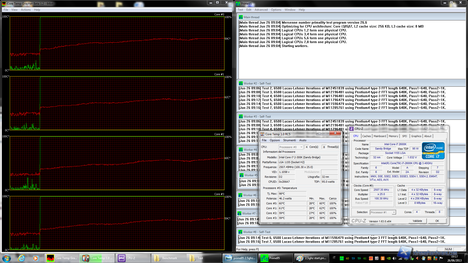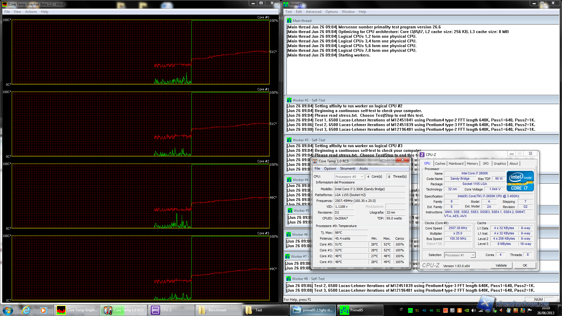 Dopo aver acceso il PC, partiamo da una temperatura di circa 28° C con una Tamb di 21.5° C. Dal primo grafico si evidenzia chiaramente come la temperatura della CPU, una volta lanciato il software di stress Prime95, va salendo e già dopo pochi minuti avevamo raggiunto una soglia di 52°C. Alla frequenza di 2507 MHz sotto stress avevamo un Vcore effettivo di 1.044V. Dopo circa 15 min abbiamo raggiunto una temperatura massima di circa 62°C su un Core con una media del die di 61.5°C. Questa temperatura si è dimostrata essere re pressochè costante negli ultimi minuti, segno che il sistema di dissipazione ha raggiunto il suo equilibrio termico di scambio con la temperatura ambiente. I valori fatti registrare a questa frequenza appaiono decisamente ottimi in quanto garantiscono un sistema di raffreddamento molto efficace. In questa situazione abbiamo misurato un consumo medio in idle dell'intero sistema di circa 29 Watt, mentre il load il consumo sale fino a circa 88 Watt.