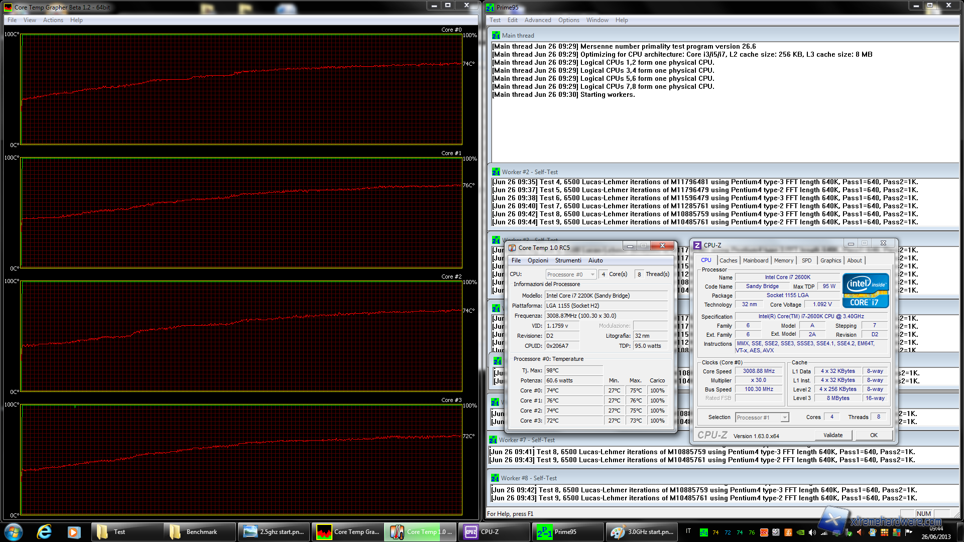 In questa prova è stata settata una frequenza di 3.008 MHz abbinata ad un Vcore di 1.092V. In questo caso dopo circa 5 minuti le temperature sono già a circa 57/60°C e tenderanno nei minuti successivi a salire ulteriormente. Nel secondo grafico, come si può vedere, abbiamo raggiunto una temperatura di 76°C su un Core, con una media sul die di 74°C dopo circa 15 min. di stress test. Probabile che nei minuti successivi la temperatura avrebbe subito un ulteriore rialzo, ma  al massimo di un paio di gradi.