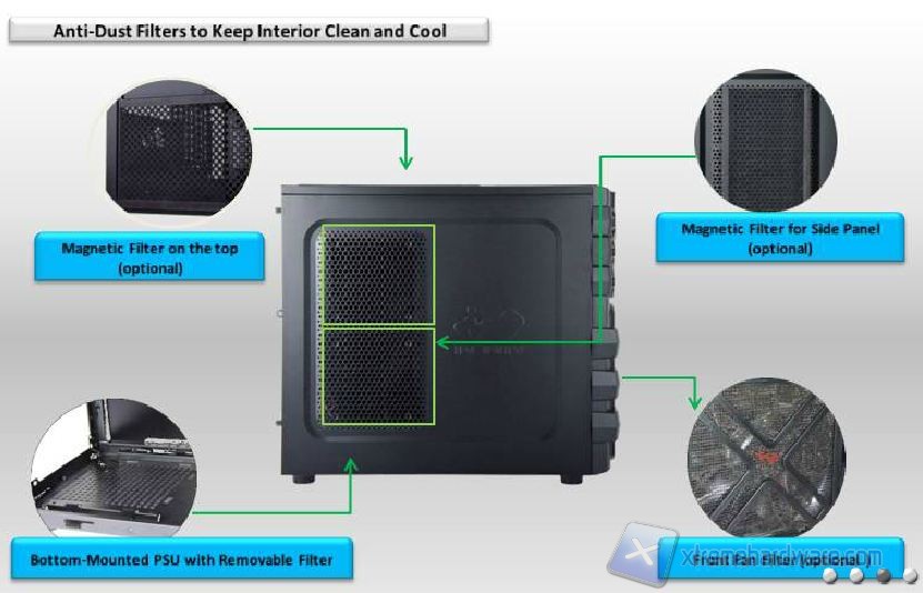 La configurazione è assolutamente classica e c’è poco da aggiungere. Sono presenti quattro piedini di supporto leggermente rialzati e non possono essere smontati per mettere delle rotelle. Ci sono dei fori di ventilazione ed un filtro antipolvere inferiore, la cui rimozione è però difficoltosa. Non c’è il supporto per cage di hard disk addizionali o per ventole accessorie. I quattro supporti sono di altezza superiore allo standard, favorendo il pescaggio di aria dal basso e limitando l’ingresso della polvere. Sarà quindi possibile posizionare il cabinet anche su una moquette o un tappeto.