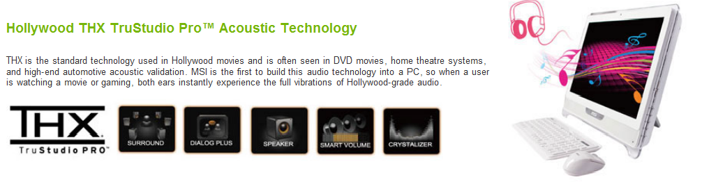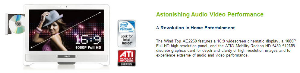 Il PC All-in-one prodotto da MSI, Wind Top AE2260, è un centro di home entertainment dotato di interfaccia a schermo di tipo multi-touch Full-HD 16:9, caratterizzato da una risoluzione di 1920x1080. Esteticamente si presenta con una linea molto gradevole e il colore bianco ne risalta ancor più questo aspetto. Il sistema operativo Windows® 7 Home Premium in versione 64bit insieme all'interfaccia multi-touch riescono a creare un perfetto equilibrio per tutti i contesti operativi. Il Wind Top AE2260 è dotato di un ampio display da 21.5" dalla resa cromatica eccellente, dal contrasto elevato ed un angolo di visuale molto ampio. Questo monitor, coniugato ad un sistema audio integrato di ottima qualità, riesce a dare all'utente una sensazione di coinvolgimento puro. Analizziamo ora le caratteristiche esclusive del prodotto; a seguire presenteremo le caratteristiche tecniche nel dettaglio: