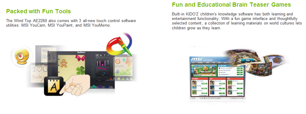 (MSI da a corredo nel Wind Top AE2260 3 utilities: MSI YouCam, MSI YouPaint, e MSI YouMemo. Inoltre ai bambini sono dedicati alcune applicazioni di intrattenimento)