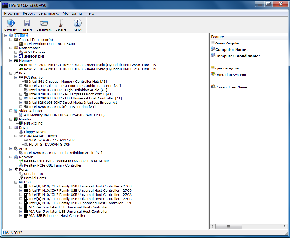 Il personal computer che ci ha fornito MSI è un esemplare di preproduzione (sample) che differisce di alcuni particolari rispetto alla versione che troveremo nel mercato retail italiano. Inoltre in alcuni paesi gli esemplari venduti potranno avere alcune differenze. Il microprocessore montato sul pc che ci è giunto in redazione è un Intel® Pentium Dual Core E5400 che adotta una tecnologia produttiva a 45nm e funzionamento da 2.7 GHz, mentre per quanto riguarda la DRAM presente nel nostro pc abbiamo una quantità di 3 GB suddivisa in due moduli di 1GB e 2GB ciascuno. Sono memorie di tipo Sodimm, DDR3 PC-3 10600 prodotti da Hynix (Hyundai Elettronics). Cpu-z riporta erroneamente come PC3-10700. Il SouthBridge è un Intel G41 mentre il NorthBridge è un Intel ICH7.