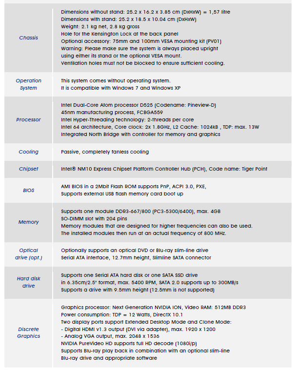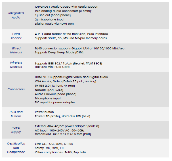 Tra le altre caratteristiche ricordiamo il sistema di raffreddamento completamente passivo, senza ventole; la connessione Ethernet tramite connettore RJ45 e supporto Gigabit LAN a 10/100/1000 Mbit/sec, supporto Deep Sleep Mode (DSM); la connessione Wireless con supporto allo standard IEEE 802.11b/g/n (Realtek RTL8188CE) tramite una scheda Mini-PCIe.