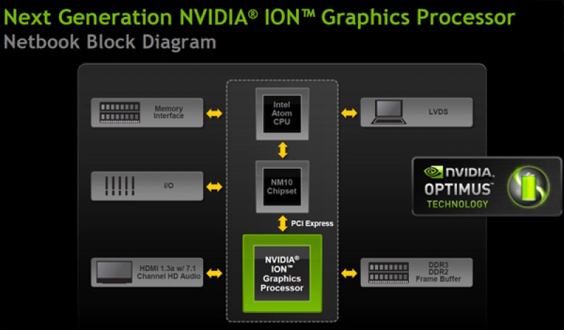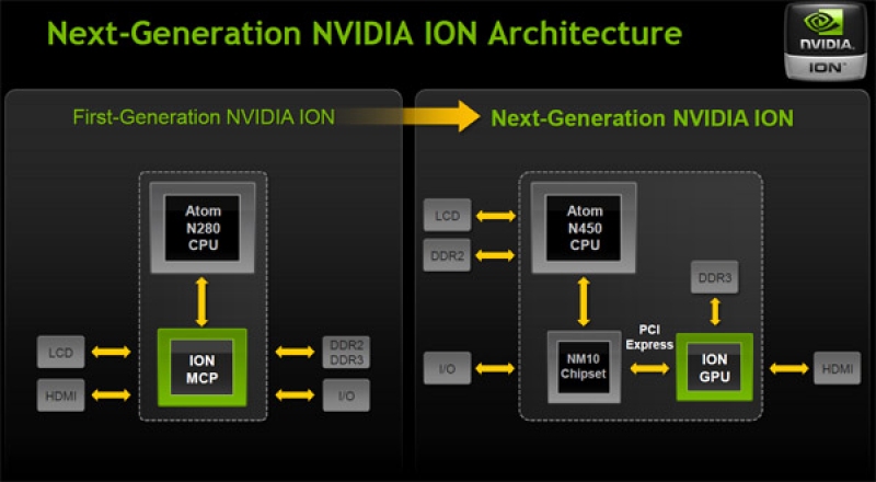 Nvidia propone la piattaforma ION su schede madri Mini-ITX ed è progettata appositamente per dispositivi netbook e nettop. Proprio a causa della maggiore potenza disponibile da parte della soluzione nVidia, Intel all'inizio si oppose al suo sviluppo ma poi cedette comunicando ufficialmente che i produttori avrebbero potuto acquistare sia la piattaforma completa, sia la sola CPU.