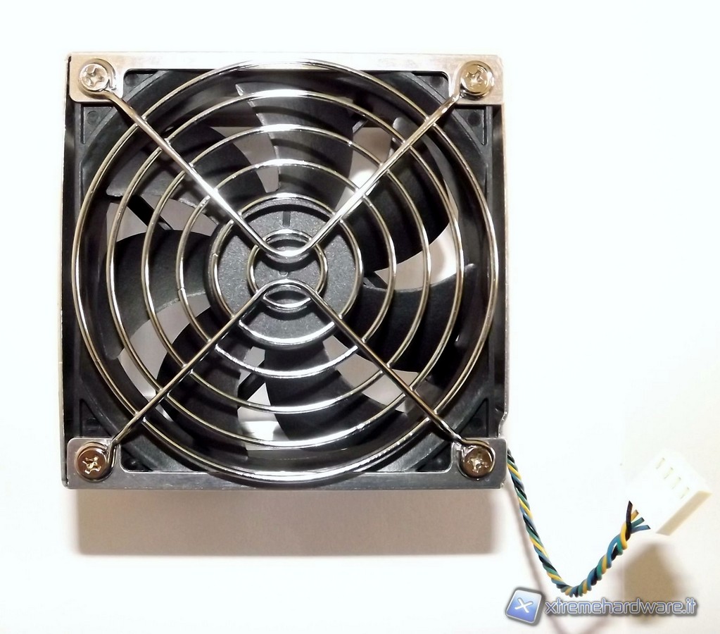 La ventola si trova protetta dentro un piccolo chassis dove è anche installata una griglia protettiva. La ventola ha serigrafata il marchio AVC, sempre prodotto a Taiwan ed è di tipo bearing idraulica con la sigla DS0922R12HP207 e connettore a 4pin, quindi in grado di essere termo regolata. Il dissipatore ICE di Shuttle è dodato di una base in rame, non lucidata a specchio; il corpo invece è in alluminio e da questa partono 3 heat-pipe che entrano nel corpo di fitte lamelle. Sia heat-pipe che pacco lamellare sono in alluminio. Nella base del dissipatore è presente un'etichetta che avverte che questo dissipatore va usato per CPU con un TDP massimo di 95W. Non è questo un problema in quanto le attuali CPU Intel di seconda generazione hanno un massimo di 95W per quanto riguarda il Thermal Design Power.