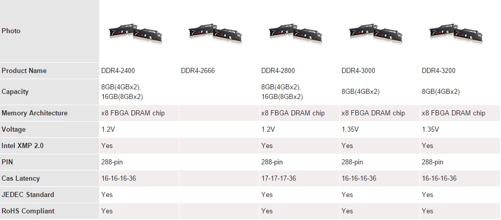 Riportiamo quelle che sono le informazioni pubblicate dal produttore circa la serie e modelli Commando. Possiamo osservare come si vada da una frequenza minima di 2400MHz ad una massima per la tabella di 3200MHz. Ricordiamo che da specifica i processori Intel e Skylake ed Haswell-E supportano memorie DDR4 fino a 2133 MHz. Frequenze superiore sono quindi da considerarsi come overclock.