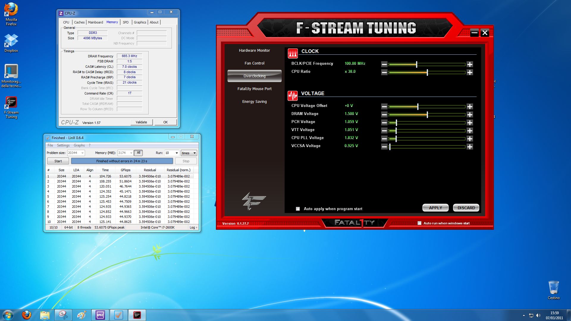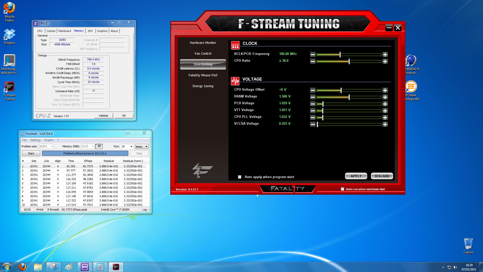 Ciò premesso, abbiamo iniziato lavorando sulle latenze alla frequenza di 1333MHz mantenendo il voltaggio entro le specifiche dichiarate dalla casa produttrice (1.50v), quindi abbiamo concluso 10 cicli del tool LINX alle latenze di 7-8-7-21 1T e su questo settaggio poi abbiamo anche provveduto a completare tutti i test sintetici e multimediali precedentemente riassunti anche nei grafici; abbiamo effettuato questo test considerando che settando la frequenza a 1333MHz, questi moduli di RAM ben si sposano con i sistemi basati sul chipset H67.