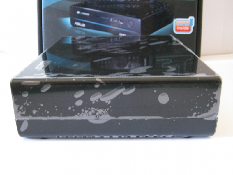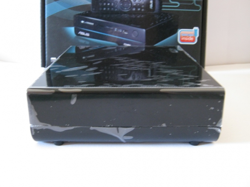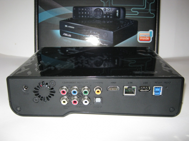 Nella parte frontale, oltre al marchio ASUS e O!PLAY in bella vista, troviamo da sinistra a destra gli slot per varie schede di memorie: CF fino a 64GB CF v4.1, SD/MMC fino a 32GB SDHCv2.0 e 2GB MMC v4.2 e MS/MS Duo fino a 28MB MS v1.43 e 32GB MS Pro v1.03. Di seguito una porta combo eSATA/USB2.0 e una porta USB2.0 e infine il ricevitore IR (a Infrarossi) che permette l’uso del telecomando IR con il lettore multimediale.
