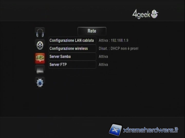 IMPOSTAZIONI: come è facilmente intuibile qui si possono impostare tutte le configurazioni di audio, video, rete, sistema, varie (in quest’ultimo menù si impostano ad esempio la presentazione delle immagini, la musica di sottofondo, o l'anteprima quando si va a sfogliare la libreria film remota). Non è presente una voce 'update', il che non vuol indicare una volontà di 4Geek di lasciare gli utenti a se stessi, ma una semplice opzione inutile per un prodotto che è uscito perfettamente funzionante e senza punti deboli.