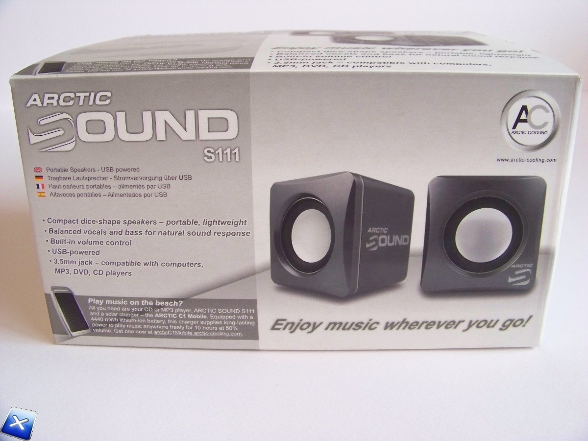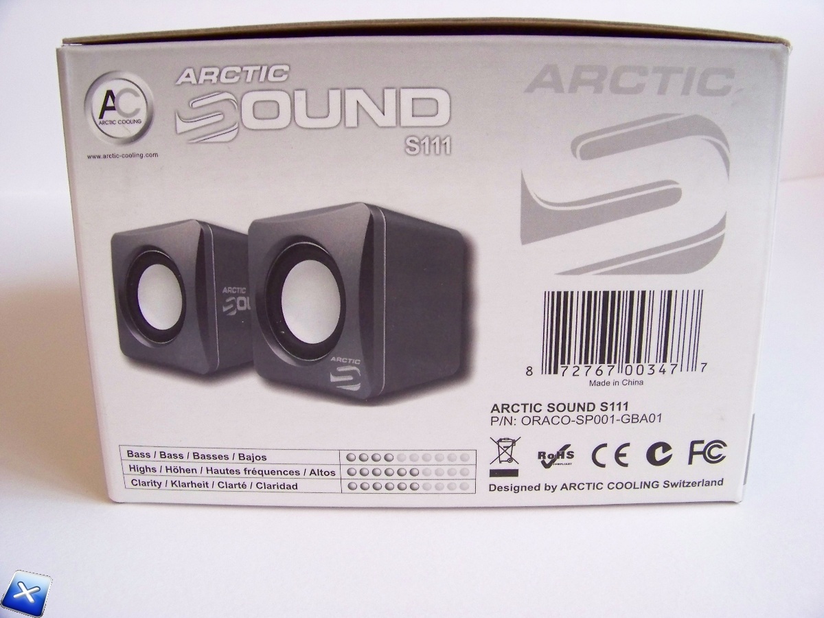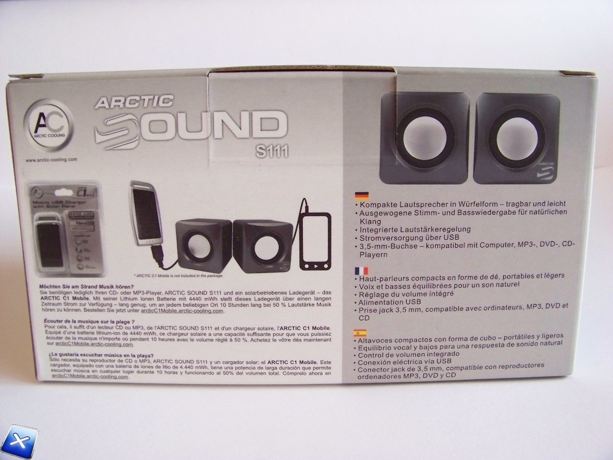 Sul retro della scatola è rappresentato il collegamento delle Arctic Sound S111 all’alimentazione Arctic C1 Mobile, oltre che alle classiche features del prodotto.
