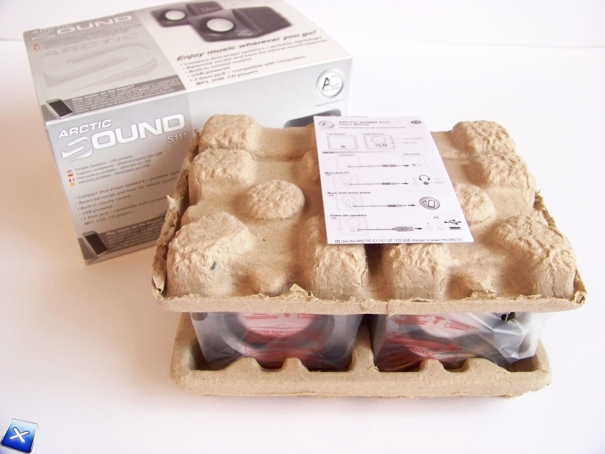 Aprendo la scatola ci troviamo di fronte al prodotto nella sua plastica protettiva e ricoperto da 2 cartoncini riciclati che permettono agli speaker di rimanere fermi all’interno del box.