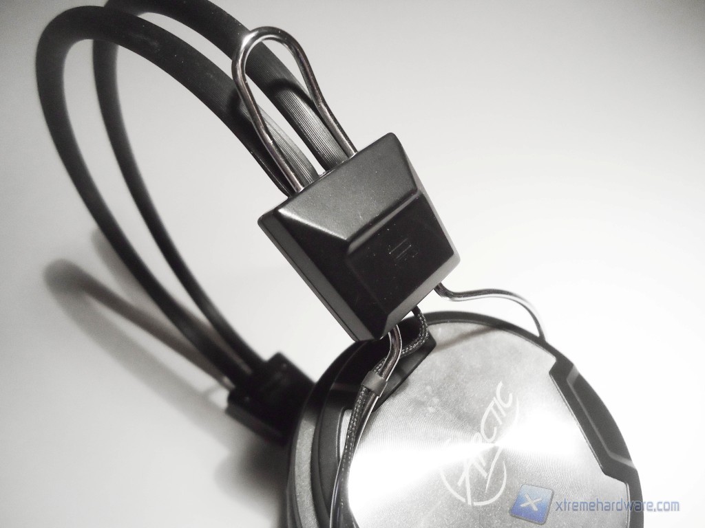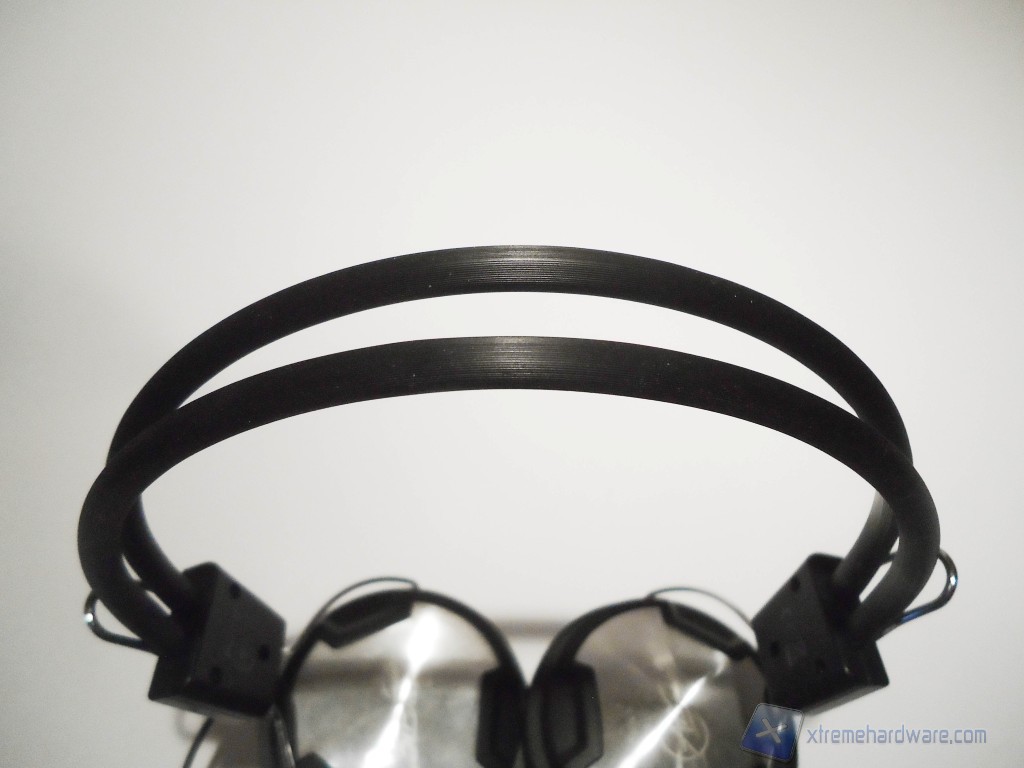 L’archetto è costituito da due stecche in metallo che nella parte a contatto con la testa sono ricoperte in plastica ruvida per consentire la massima aderenza sul capo. L’imbottitura è assente, ma non risulta un problema in quanto le cuffie sono molto leggere.