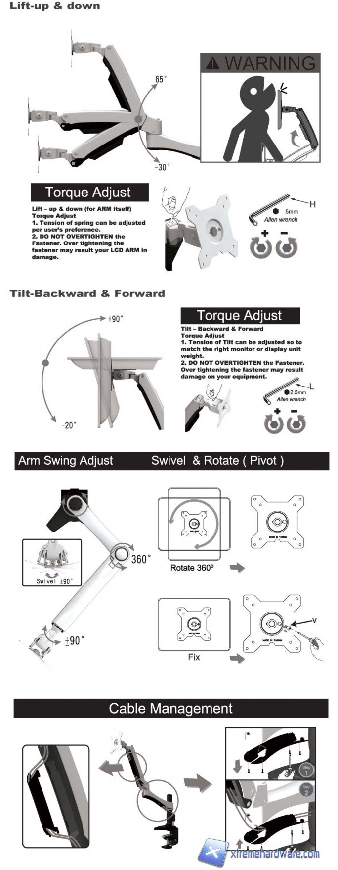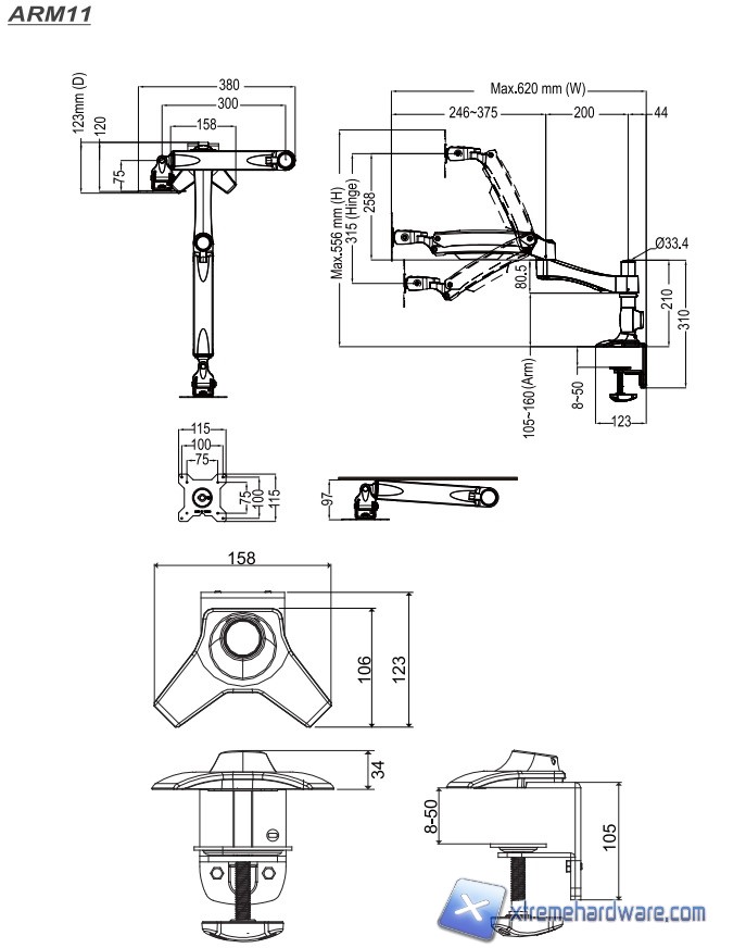 Il SilverStone ARM11BC ha dimensioni complessive di 500 x 497x 619mm ma come vediamo dall’immagine avremo la possibilità, come ogni altro stand per monitor che si rispetti, di ruotarlo e di posizionarlo nel modo che più ci soddisfi. Il SilverStone ARM11BC ha una base d’appoggio e di blocco davvero ridotta. Questo ci permetterà di ridurre notevolmente anche lo spazio sul piano d’appoggio, in questo caso una scrivania, a tutto vantaggio dello spazio utilizzabile per posizionare fascicoli o cartelline, in caso di un ufficio, o un modem, una tastiera o quant’altro in ambito casalingo/privato. Lo stand di SilverStone pesa, senza eventuale monitor, circa 4Kg infatti noteremo la qualità dei componenti appena estratto dalla confezione. Parlando di angolazioni, come vedremo dall’immagine a seguire, avremo la possibilità di ruotare il monitor sull’asse orizzontale di 90 gradi montato sul perno finale, mentre di 360 gradi sul perno centrale che congiunge i due bacci in metallo. Potremo anche portarlo in avanti di -20 gradi o indietro sull’asse verticale di +90 gradi. Caratteristica interessante è anche il braccio secondario che tramite un sistema a molla e vite esagonale potrà essere bloccato a varie angolazioni. Il bundle del SilverStone ARM11BC è completo di tutto nonché di un manuale con i vari passaggi.